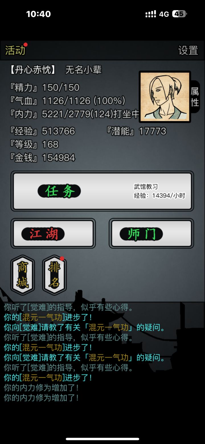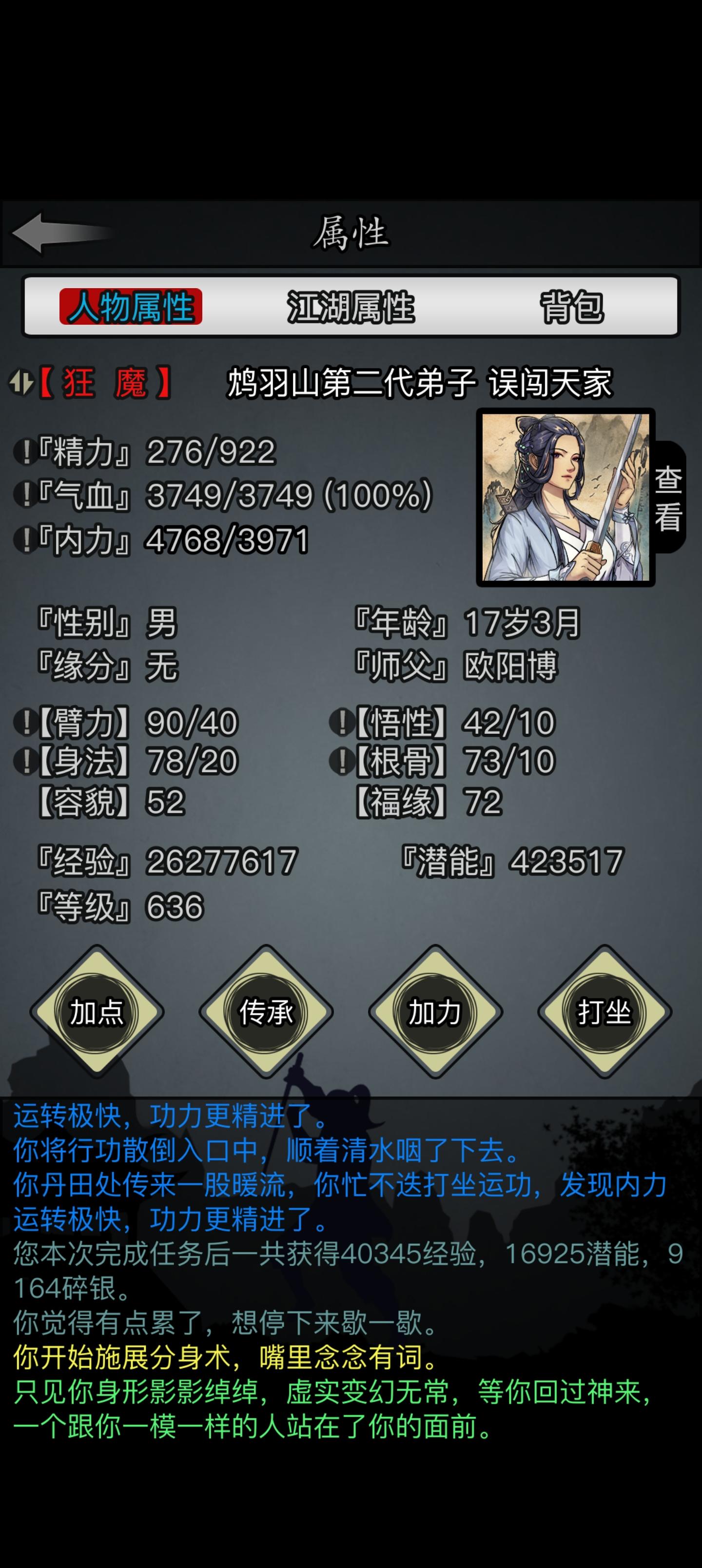 前段时间突然想要开一个新号,于是决定要不就玩一下六世散人。立此贴为起点,督促自己坚持下去!其实接触这游戏蛮久了,我是当年小程序玩家(没错,放置江湖出过小程序版本),当时玩到三转就关服了,也没要退款,而是移植到新服,后来玩了几天不想玩了就给YES了。所以,算是弥补当年的遗憾,也算是重新拾起初入江湖时的热情。零转!零氪!六世散人!从这里开始!从今天开始我会以至少三天一更新的速度发布此角色的进