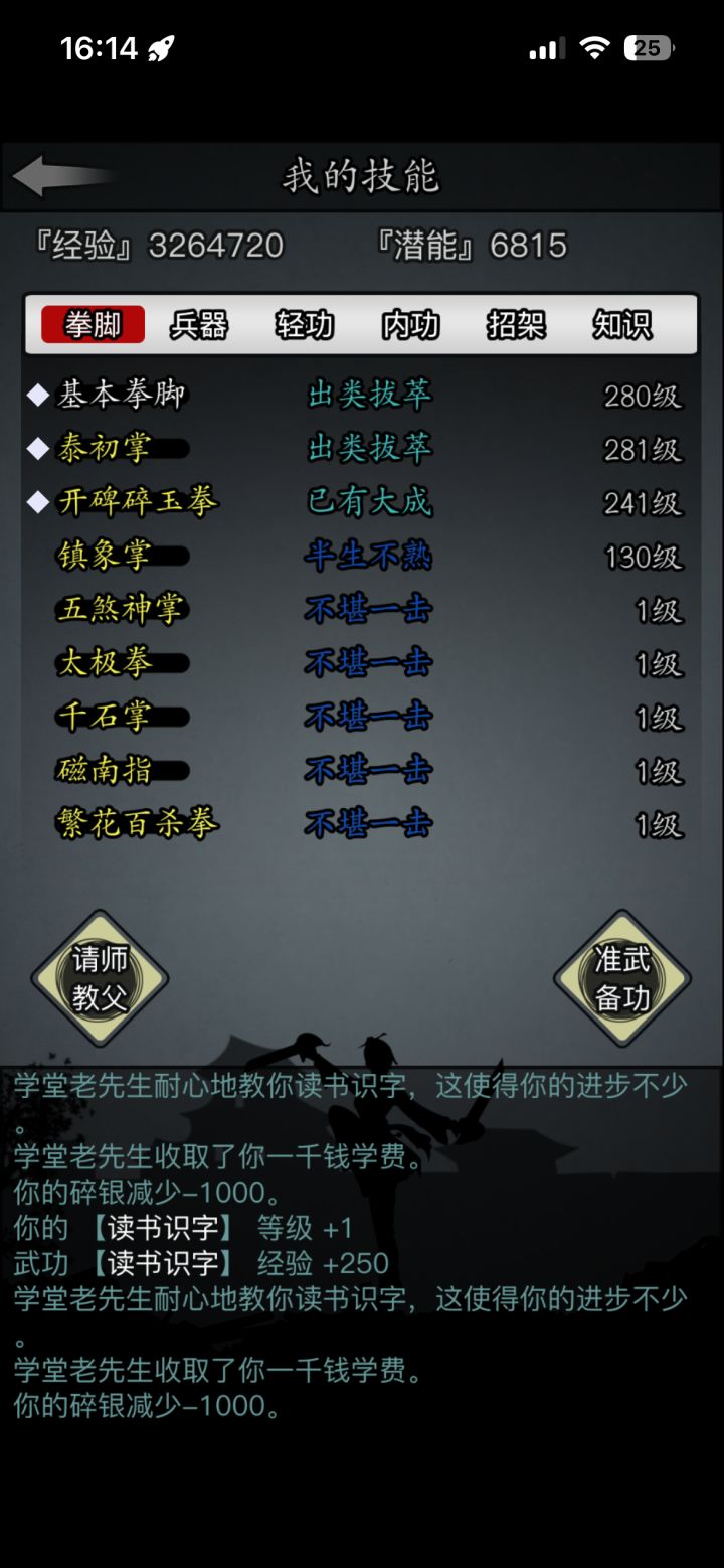 我现在不知道要干啥,挂一夜也升不了多少级。减法内功招架。我不知道学的对不?,请大佬指点,一二