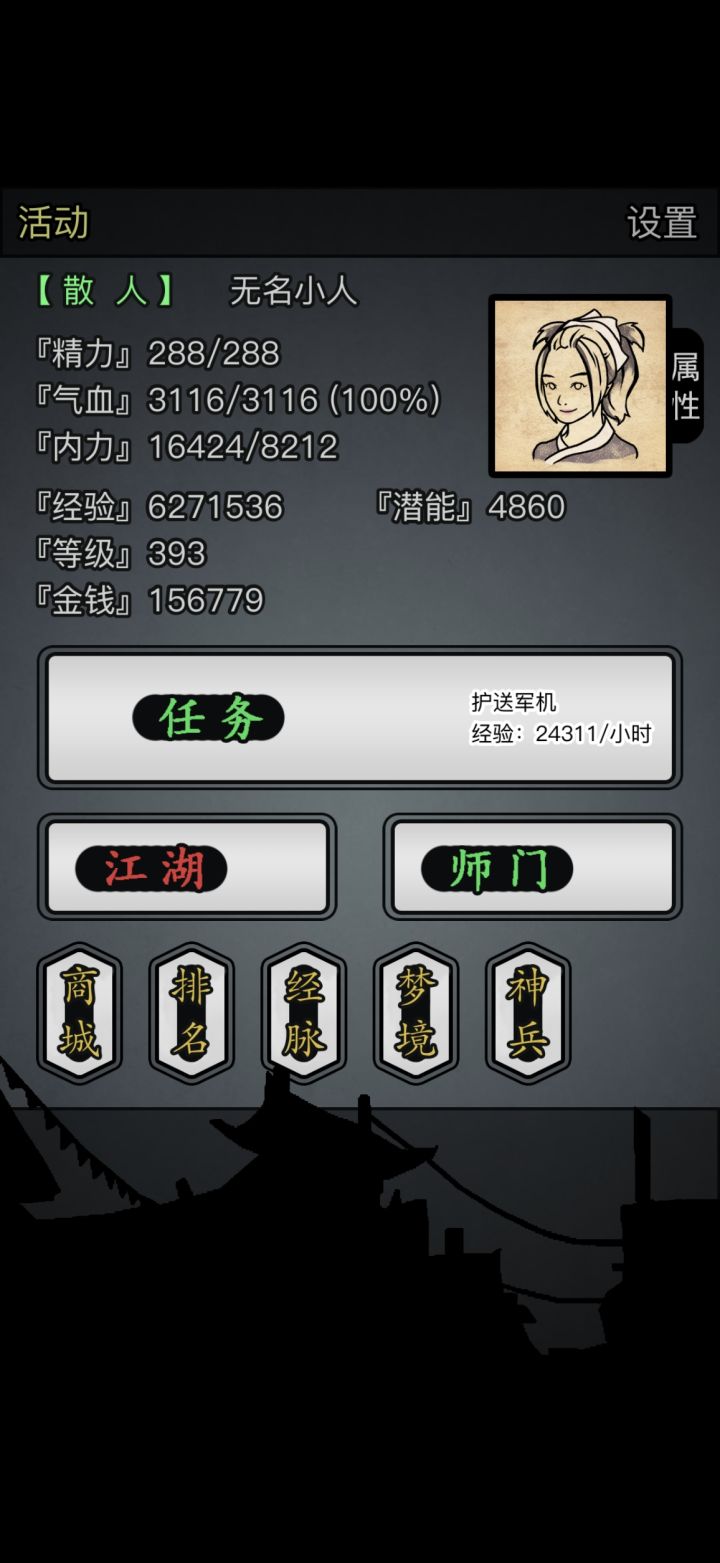 前段时间突然想要开一个新号,于是决定要不就玩一下六世散人。立此贴为起点,督促自己坚持下去!其实接触这游戏蛮久了,我是当年小程序玩家(没错,放置江湖出过小程序版本),当时玩到三转就关服了,也没要退款,而是移植到新服,后来玩了几天不想玩了就给YES了。所以,算是弥补当年的遗憾,也算是重新拾起初入江湖时的热情。零转!零氪!六世散人!从这里开始!从今天开始我会以至少三天一更新的速度发布此角色的进