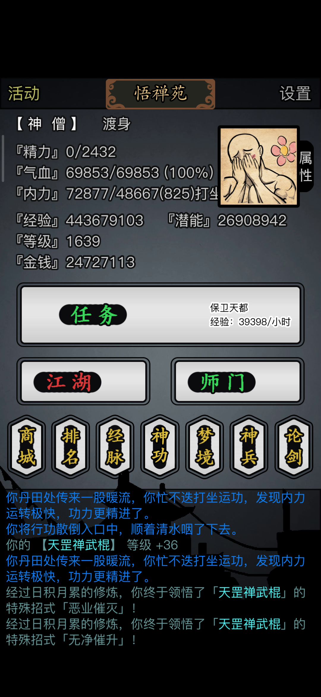经过两天时间,以及500元宝和三十多张残页被交易的代价换来了少林的声望棍。经过数次殴打达摩后感觉这是一个偏向于以技能作为主要输出手段的暴力棍法。 天武棍耗气比达摩神禅杖法更低,属于标准的1/2气武学,攻速比达摩神禅杖法更高,特效更足。查阅主动查询表后发现恶业的cd极短,PVP与pve的场合中cd均为10,在顶级武学中属于非常短的一类。 初步来看可以组成天武棍易筋经落水套,以落水的高额卸力和易筋经深厚的护盾来给天武棍提供血量方面的支撑。适用于五转偏后期的PVP场合。