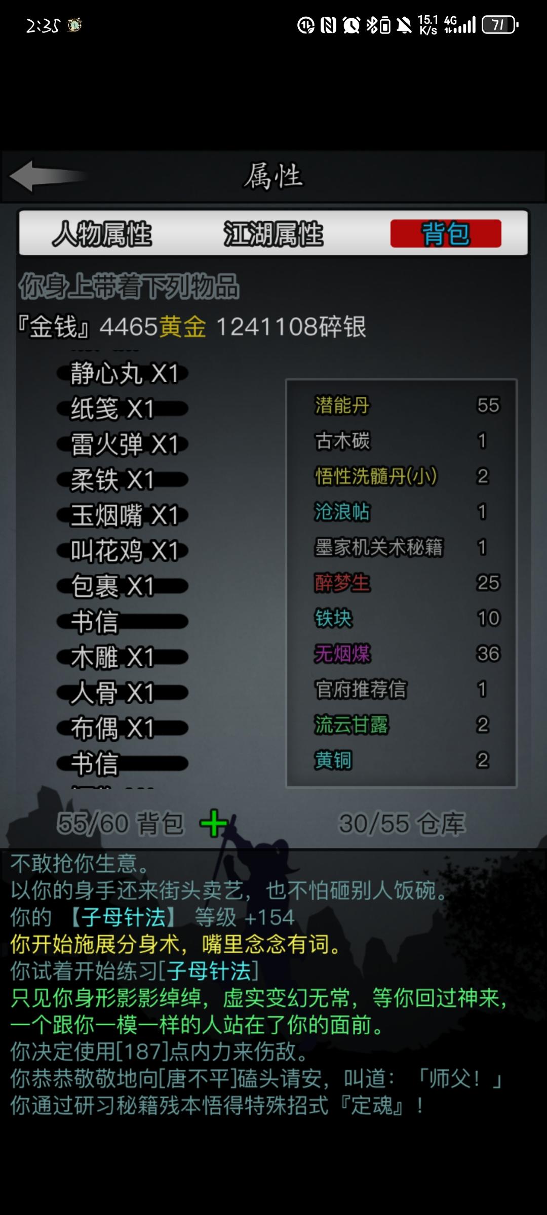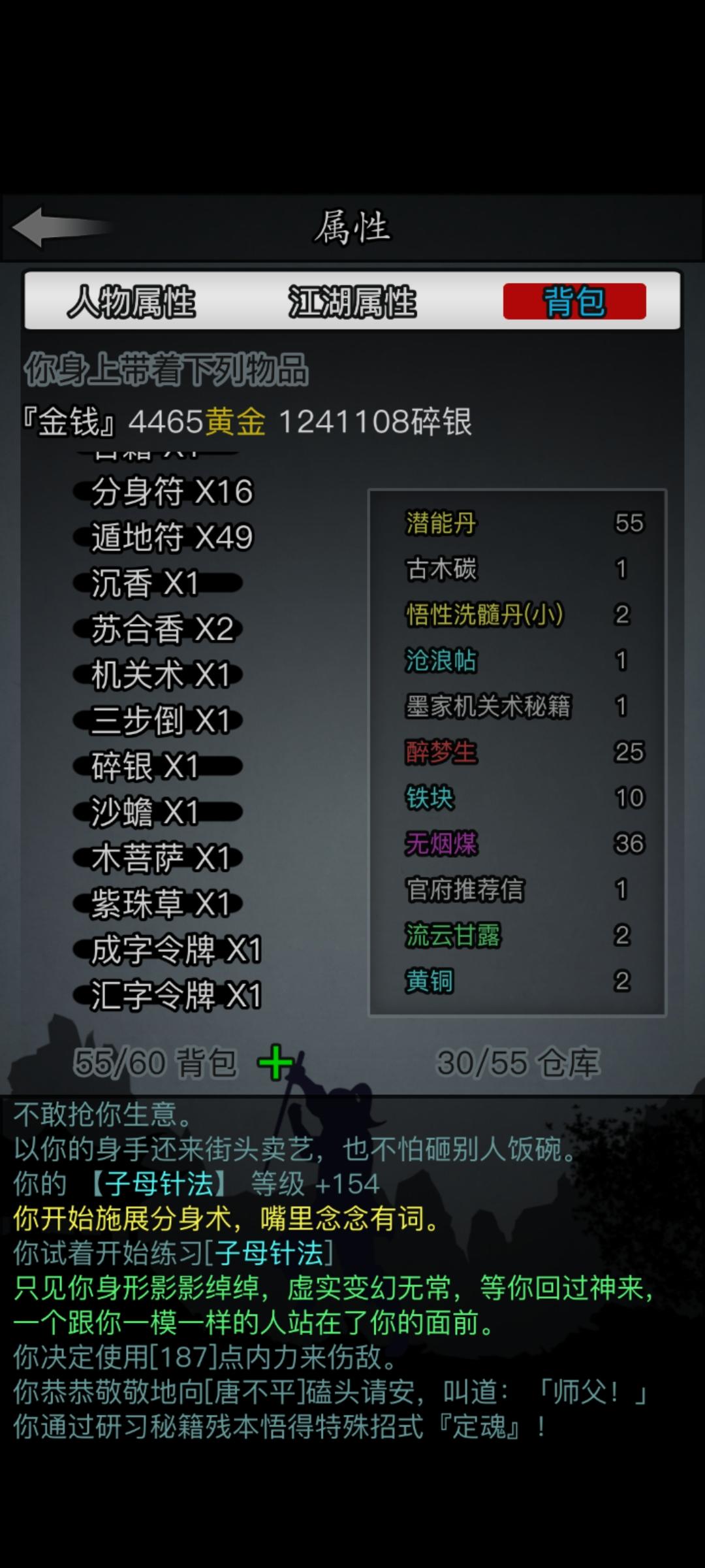 推图到第31章,终于挖完长生诀,就等阴阳了。上次香囊感觉溯源想用到要等很久,就换了七星这次香囊换哪个好?鬼步先排除,狂骨想用要等挺久,这俩应该都可以不要。珍宝阁换了个58棍,但是舍不得用天机升88。银票攒了1w多了,纠结阳口还是高门。
