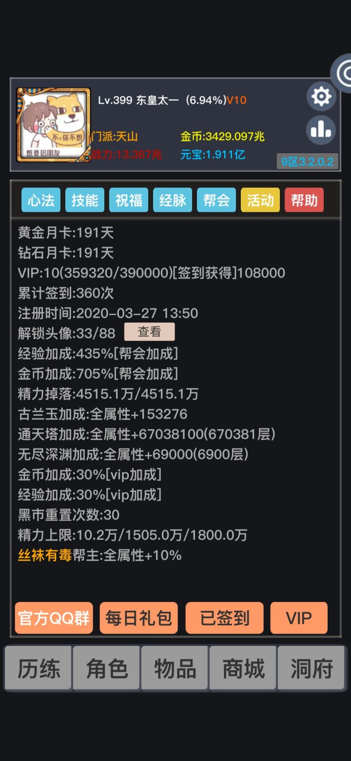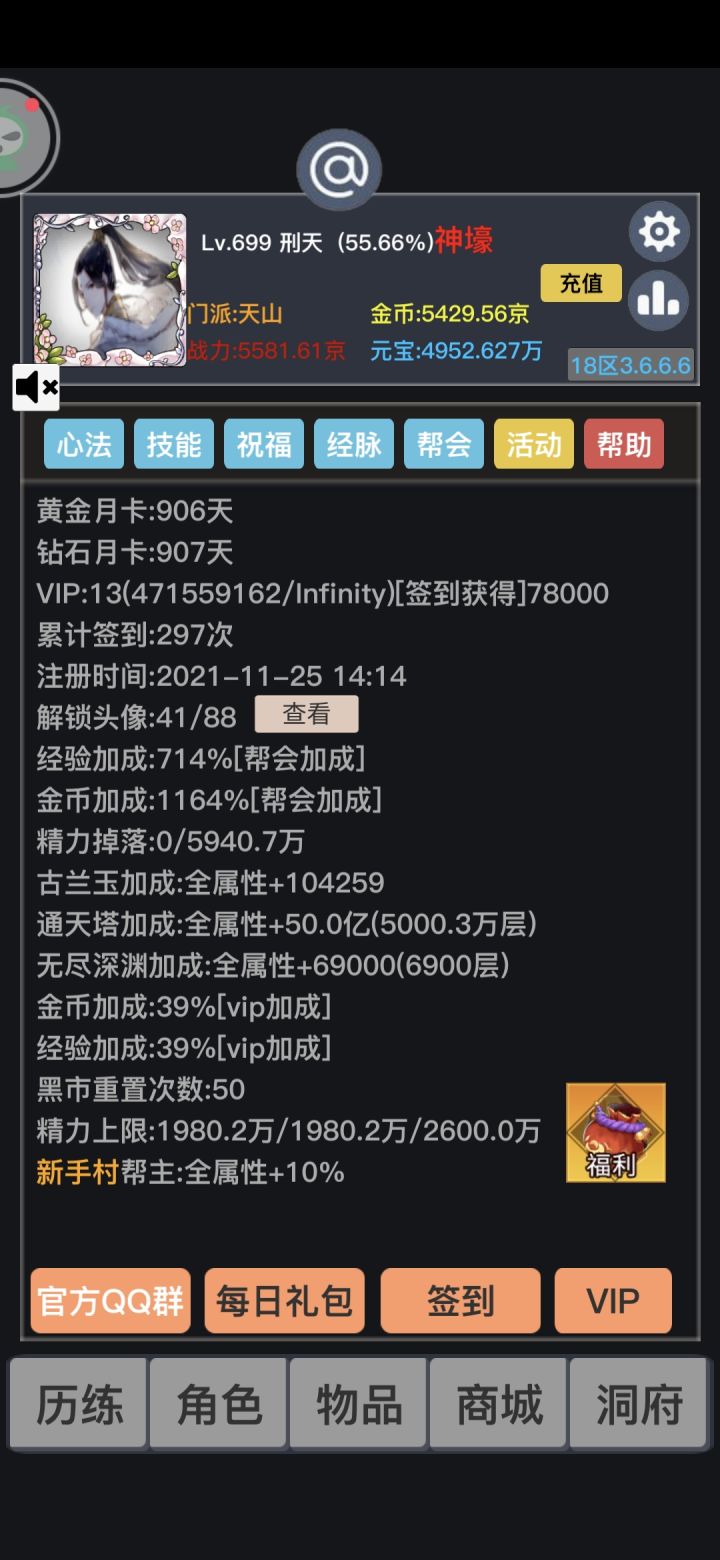 两个号,一个是21区的,一个是18区的首先呢,关于游戏体验问题,对于我个人而言,很爽,真的很爽。18区的账号被改签过,实际登录天数只有267天,5000多京,氪金的话不超过300,我知道很难以置信,但事实确实如此。我常说,不到一年的时间,走完了大佬,两年该走的路程。甚至有的老人也已经被我超过了。十天破兆,110天之内破京。虽然对于真正的大佬不算什么,但愿是对于我这种白嫖而言,真的很有成就感。这