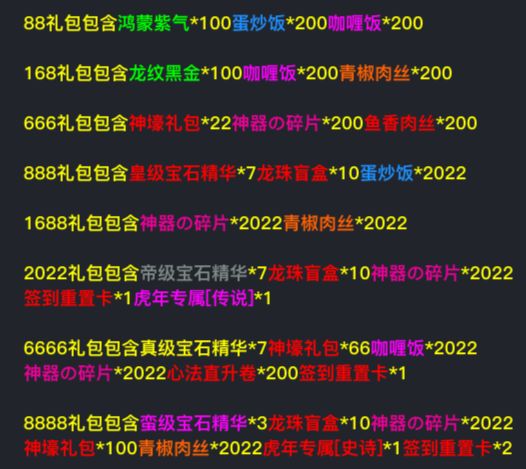 将于2022年8月6日上午9:00开启新区同步开启以下活动一、元宝购买限时活动以下限购活动当角色等级100级以上可以参与,每个档位限制购买1次。其中食物包指的是:蛋炒饭、牛排、咖喱饭、青椒肉丝、鱼香肉丝。 二、充值活动1. 活动时间内累计充值奖励 备注:累计活动可以重复领取,每领取8888奖励后重置!多余的虎年专属可以找丝袜兑换签到卡,签到卡的作用和每天签到的作用一样。兑换比例:传说兑