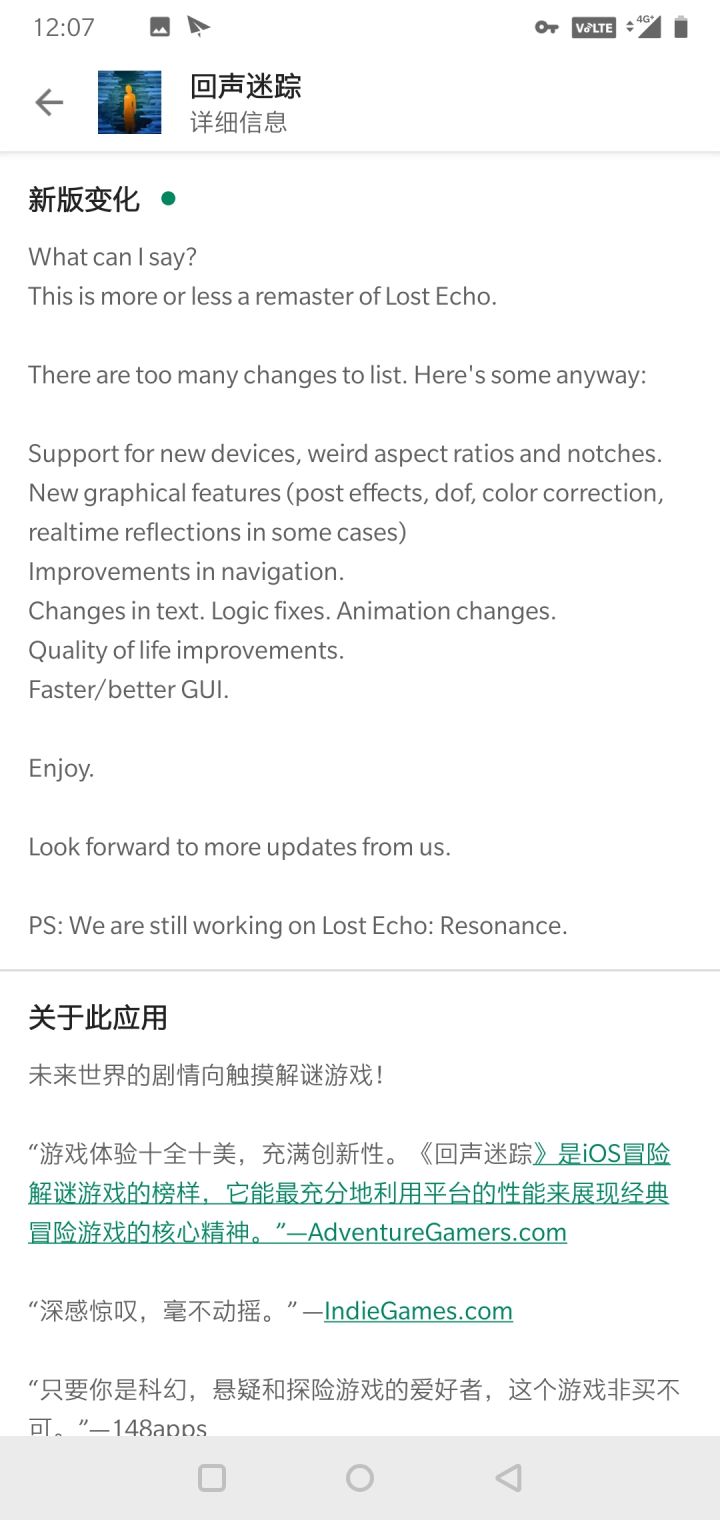我能说什么呢?这或多或少是失落回声的重新定位。列表中有太多变化。以下是一些:支持新设备,奇怪的宽高比和缺口新的图形功能(后期效果,自由度,色彩校正,实时反射在某些情况下导航改进。文本更改。逻辑修复。动画更改。质量改进。更快/更好的GUI。Enjoy!期待我们的更多更新ps:我们仍在研究回声迷踪:共振