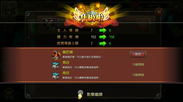 1.新手教程上来应该修改一下,在第一场战斗就告诉玩家可以手动,并且说怎样手动,比如点击皇埔吧(那就做到第二场有了皇埔好做)在点击地面自动什么的,不然会有很多人连新手教程都打不完就AFK。2.大约打了第七级升第八级的时候有一个小bug吧。如图修改后应该为庄园农舍和排行榜都在第九级开放。3.在第八级时开放铁匠铺。我建议应该把铁匠铺的引导修改一下,因为铁匠铺在后期是一个非常重要的地方。比如在你八级之后