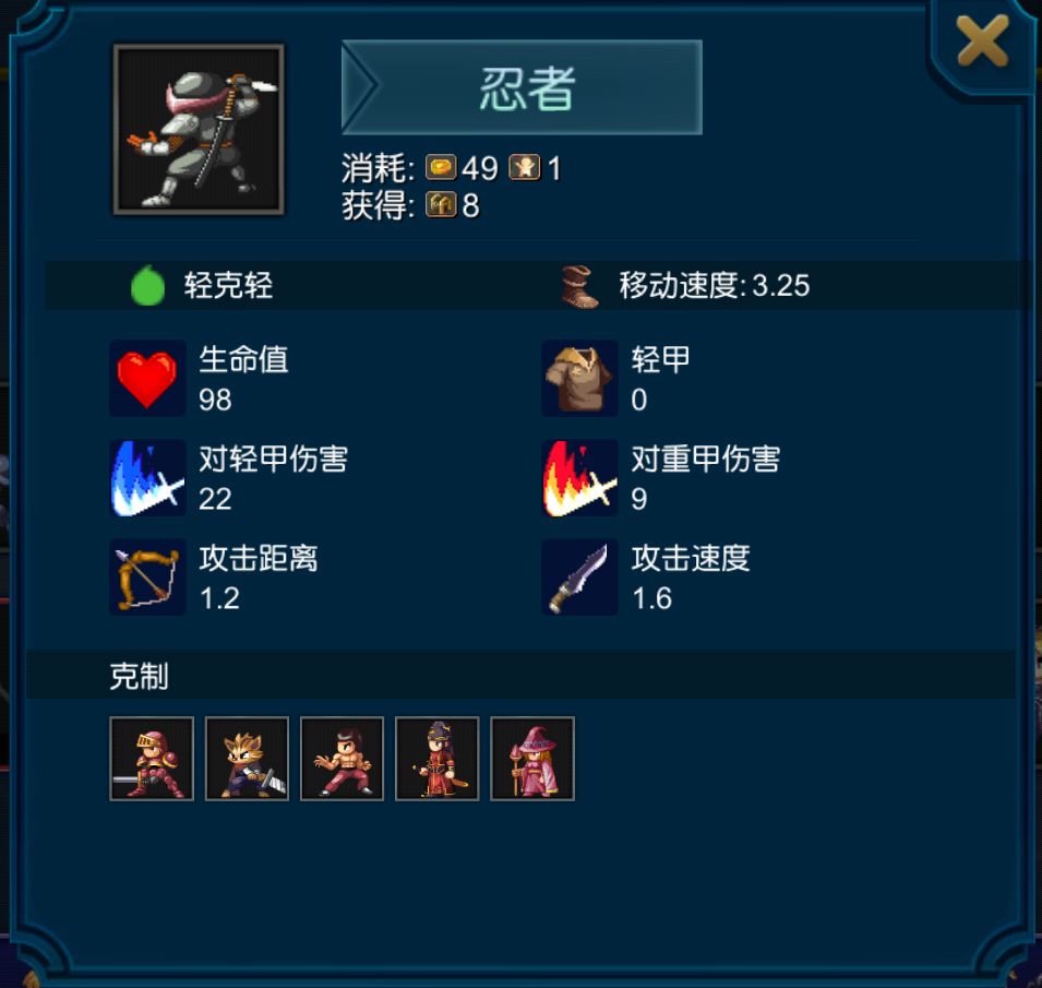 这三个兵种分别是忍者,魔童和飞刀手,我发现现在的新手很多都没注意到这三者的优劣区分,但前期的纯一阶兵阵法里,几乎可以说最重要的一个阵法就是用剑兵搭配这仨的任选其一,所以我认为有必要为各位讲解一下这三者的优劣,在这里有必要延伸一个概念,那就是对于一阶兵来说,无论是对轻伤害还是对重伤害,能大于等于25点就是一个关键的伤害节点,一阶兵及部分二阶兵对战过程中,大部分兵种少打一刀的伤害线就恰好是25点伤害,