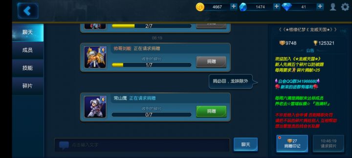 ★龙威天国★公会招人,贡献多有奖励,气氛活跃,附赠游戏攻略,每天七个碎片包满,搜龙威申请即可,想来的私聊新人@我,我捐碎片给你们
