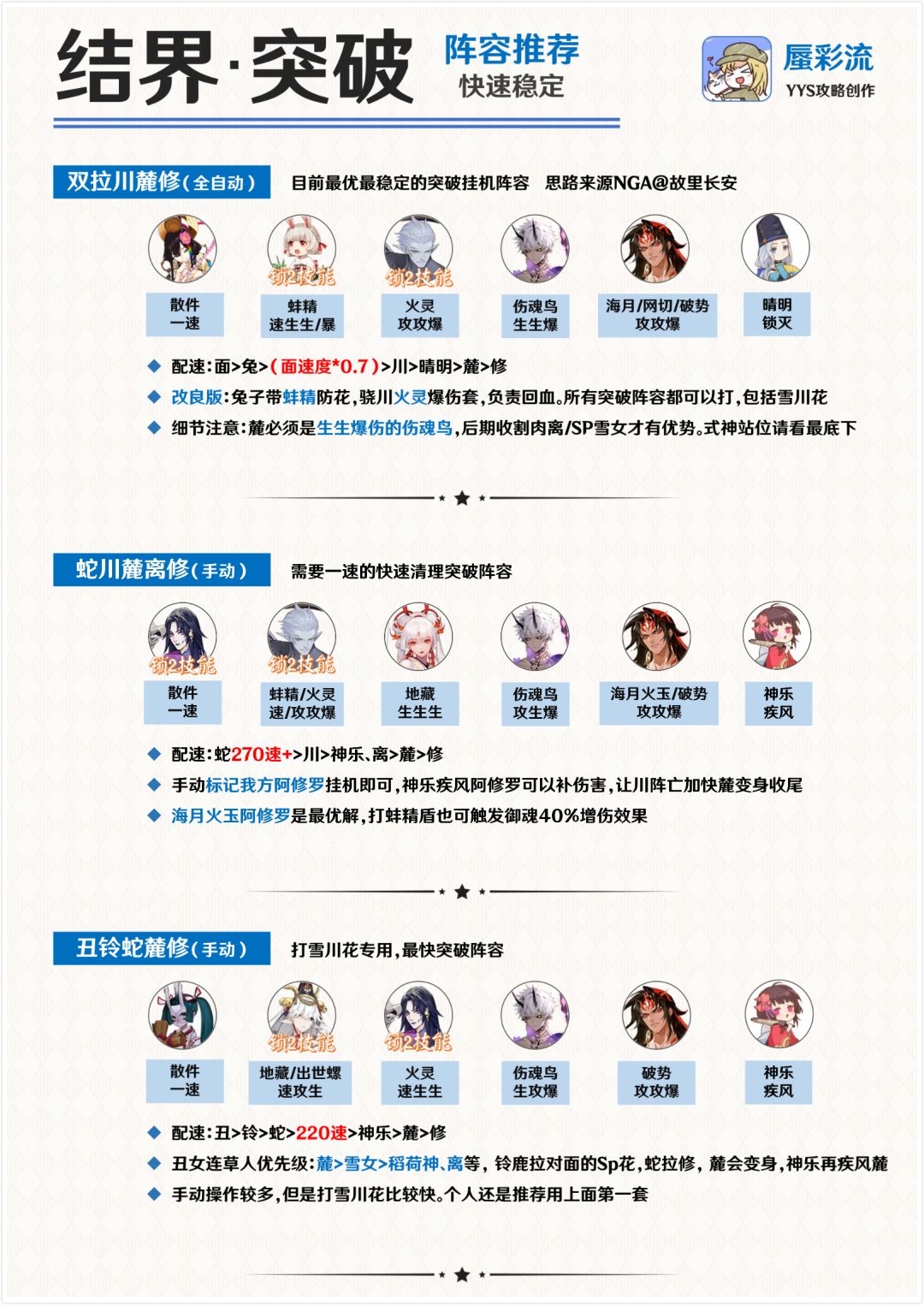1.道馆推荐全自动挂机阵容,非常好用!(包括式神御魂佩戴,变阵选择,以及式神站位)能有效提高胜率! 2.结界突破推荐双拉川麓修,或者道馆全自动阵容,基本雪花川等难打的结界都没问题!