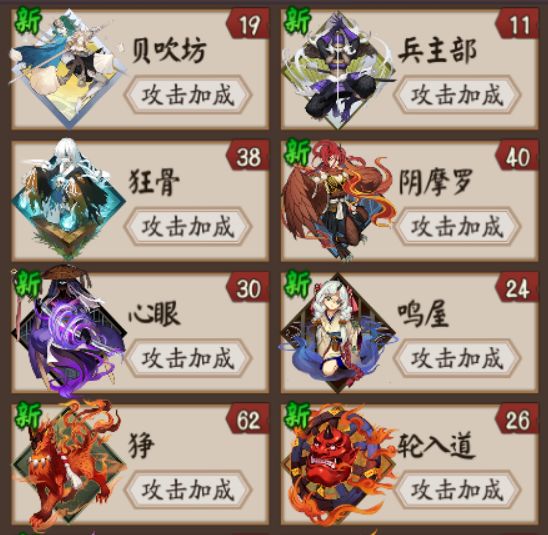 鬼切: 破势/针女/网切/地藏/狰(攻攻暴/爆伤) 御馔津: 破势(攻攻暴/爆伤) 返魂香/蚌精/木魅(生抵生) 化鲸: 招财/返魂香/木魅/轮入道(速攻攻) 稻荷神御馔津: 招财/火灵/木魅(速抵生)魅妖/雪幽魂(攻命生) 彼岸花: 针女/破势/狂骨(攻攻暴/爆伤) 魅妖/反枕/雪幽魂/钟灵(生命生) 食梦貘: 招财/火灵(速命生) 辉夜姬: 火灵/蚌精/木魅(生生生/生生暴/生生爆伤) 大岳丸