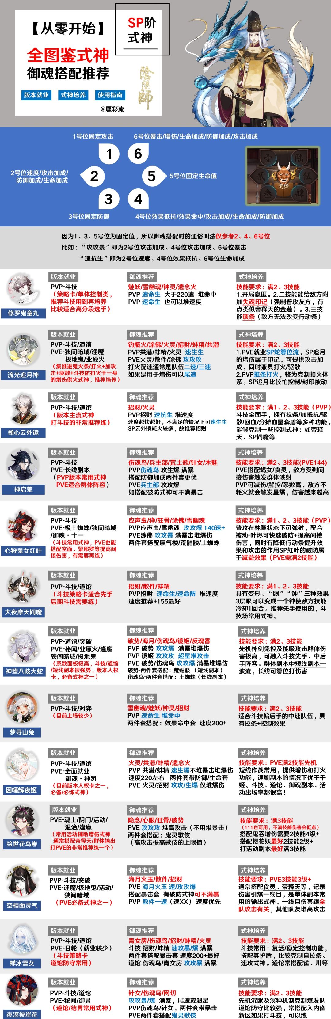 1.攻略主要是为了萌新开荒,给式神御魂搭配提供建议,附带一些就业场景和技能要求。【排版是采用从新到旧的式神顺序】 2.主要分了SP阶、SSR阶、SR阶2图、R阶、联动式神这几张图,因为式神众多不太可能把所有想写的浓缩到里面去,但对于刚刚接触或者回归阴阳师的玩家来说,我想应该足够了~(N卡和呱没写) 3.式神培养还是按照版本强度,同时结合个人喜好来。每张图最底下有个人推荐的式神培养优先度。 4.对于