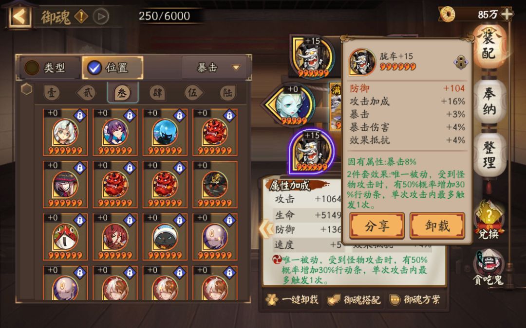 整体御魂整理 整理思路是从整体到局部,so第一步就是先对所有御魂进行一个基本筛选,这样接下的分类别整理会事半功倍~防御加成如果不能加速度收益不大,命中抵抗暴击暴伤等对附属性要求很高的御魂也可以先整理 特殊御魂整理 目前在斗技上非常吃香各类式神都能用的五个御魂!而且获取难度都比较大,所以需要拿出来单独整理,有有用属性的就全部留下!尤其是招财猫,以下会把需要留下的属性一一列举。 暴击加成御魂 输出用的