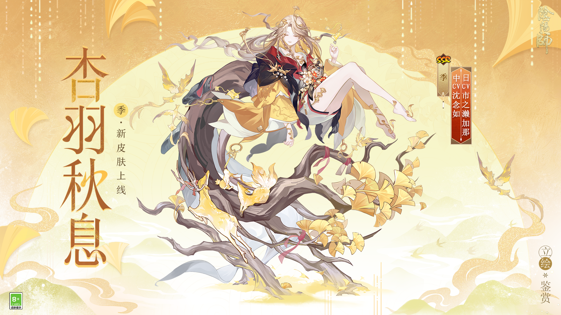 森林低语回响耳畔,微风轻拂,银杏簌簌飘落。金晖尽染,秋色正好,少女阖眸垂首,聆听万物吟颂歌谣。 季新皮肤「杏羽秋息」将于1月1日0:00上线,可通过花合战·睦月获取,参与活动达到指定条件,即可获得限定头像框「鹿栖秋影」,购买墨染花札·典藏版,还可获得「签到主题·杏羽秋息」、限定动态头像框「鹿栖秋影·岁迹」。在花合战·睦月中等级达到20级可解锁专属插画「四时秋隅」,购买墨染花札并在花合战·睦月中等级