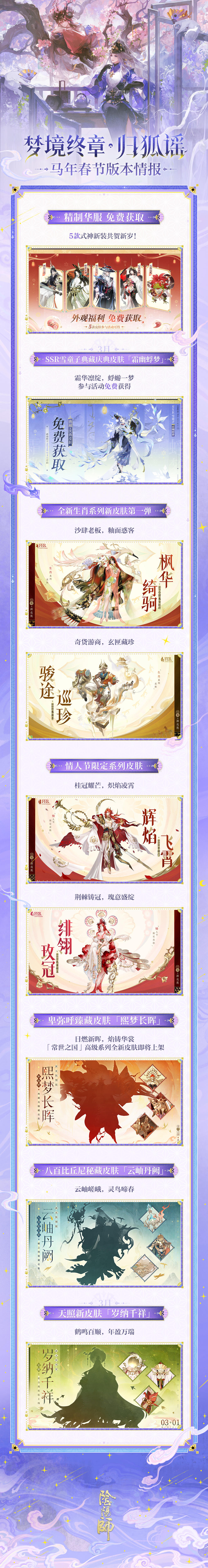 岁序更迭,万象更新。料峭春风携来桃枝,以花为笺,为大人许下新年的祈愿~ 全新SSR阶式神 葛叶、SP阶式神 灼华桃花妖将于2月11日降临平安京!全新版本及剧情篇章「梦境终章・归狐谣」同步开启!还有多款免费春节华服上线,佳节好礼相赠等一大波资讯向大人袭来~ 式神崽崽齐聚一堂,特邀主持人灼华桃花妖已就位!大人快戳开下方视频,和阿扫一起前往阴阳师马年春节版本特别前瞻现场看看吧~ 更多相关情报,请大人们留