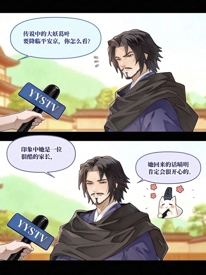 近日有传闻,大妖葛叶即将降临平安京!(✪ω✪)阿扫立马扛起麦克风,跟着平安京电视台记者到街上采访了一圈!来看看大家都是怎么回答的吧~#崽崽观察手札 #阴阳师马年春节版本 #阴阳师 #新式神葛叶