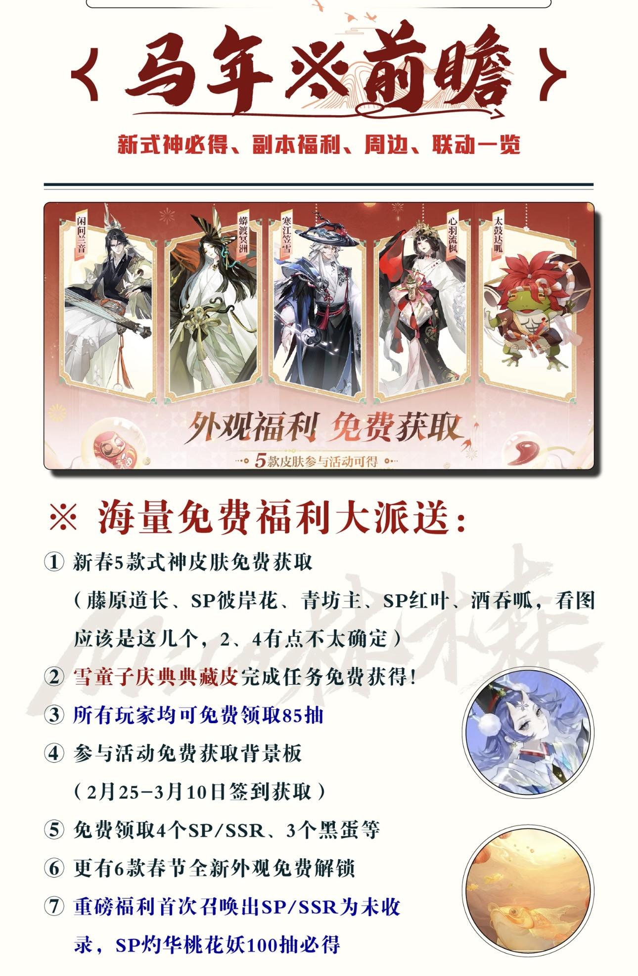 阴阳师马年新春版本前瞻:SSR葛叶+SP桃花妖双神降临,百抽免费送SP!版本定档: 阴阳师马年春节版本「梦境终章·归狐谣」将于2月11日正式开启,SSR葛叶(群体输出式神)与SP灼华桃花妖(治疗/复活)双神同步上线,版本福利力度堪称"最适合入坑的版本"!核心福利速览:百抽必得SP桃花妖:累计召唤100次即可免费领取全新SP灼华桃花妖70次免费召唤:预热活动送70抽,首次召唤SSR/SP必