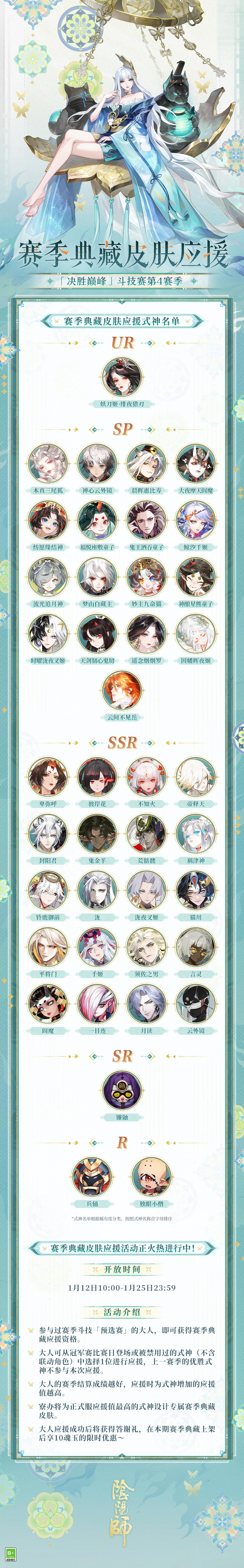 「决胜巅峰」斗技赛第4赛季圆满落幕,赛季典藏皮肤应援已于今日开启,寮办将为应援值最高的式神设计专属赛季典藏皮肤!扫地工在此为大人奉上入围式神名单和活动规则,快为心仪的式神应援吧!#阴阳师月自长梦升 #阴阳师