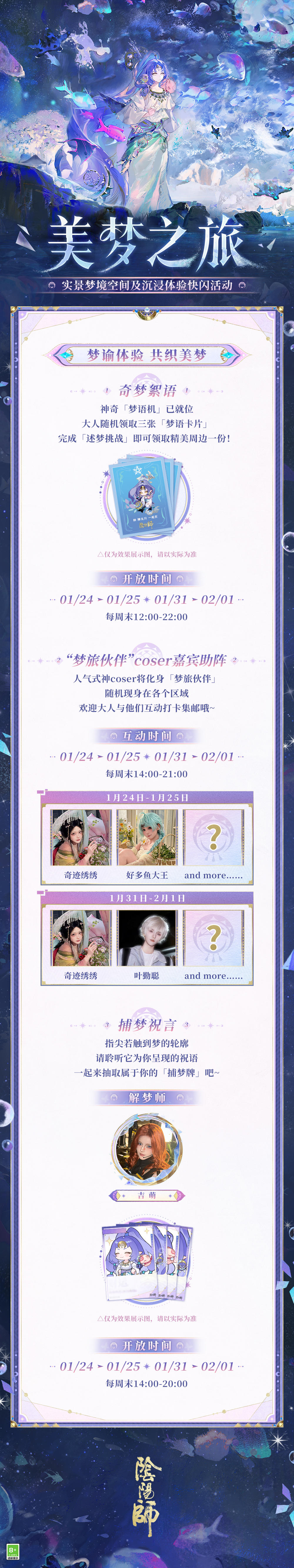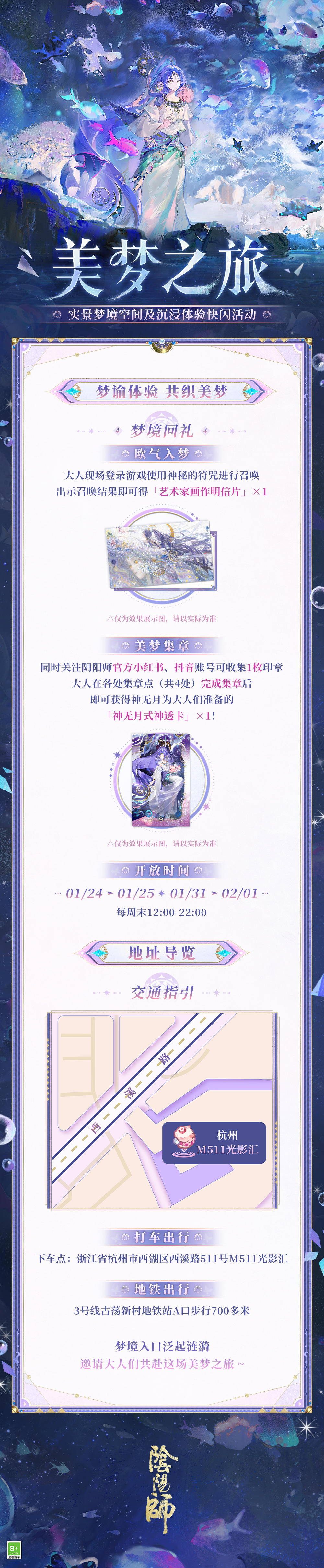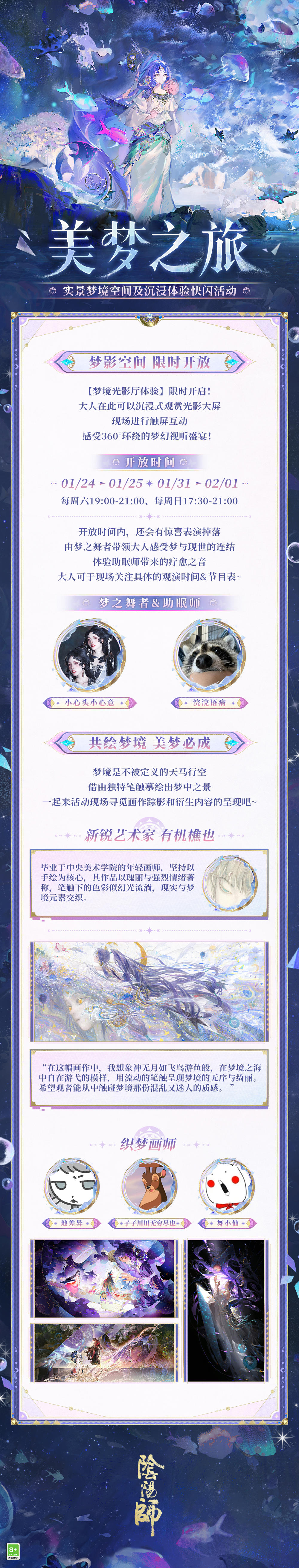 奎宿巡天,狼影逐群星,万相星文凝刻苍刃,剑引星光镇守八荒。 △全新「步野观星」系列皮肤即将上线!源赖光新皮肤「奎狼逐刃」将于1月21日维护后-2月10日23:59限时上架「星品专卖店」活动,大人参与活动祈愿即可兑换。 ※活动期间,大人使用「星宿福札」进行祈愿可获得「星宿印记」等奖励,首次进入活动可获得5个「星宿福札·免费」。「星宿印记」可用于兑换商店中两款全新限定皮肤,两款全新姿度「晴明·星仪纸扇