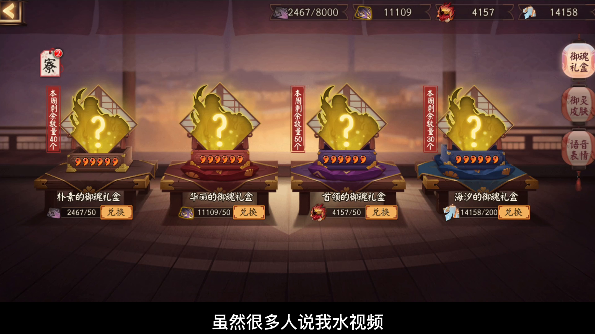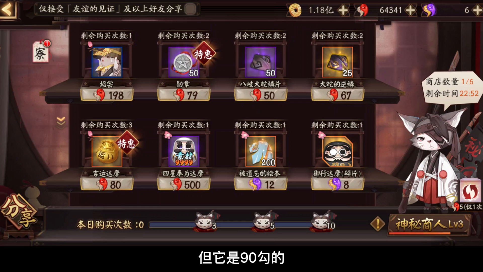 阴阳师:每周星期三、星期六会出现的神秘奸商又出来营业了,大佬们,90勾玉的蓝票买不买呢?我选择的是不买,我试过几次刷新以后出了70/80勾玉一张蓝票的,我感觉我被奸商坑了,所以我这次刷新了一下,幸好没被坑,顺便买一点小结界卡去合成一下胧车,为了太鼓而努力。#攻略#游戏推荐#单机游戏#游戏福利#游戏讨论