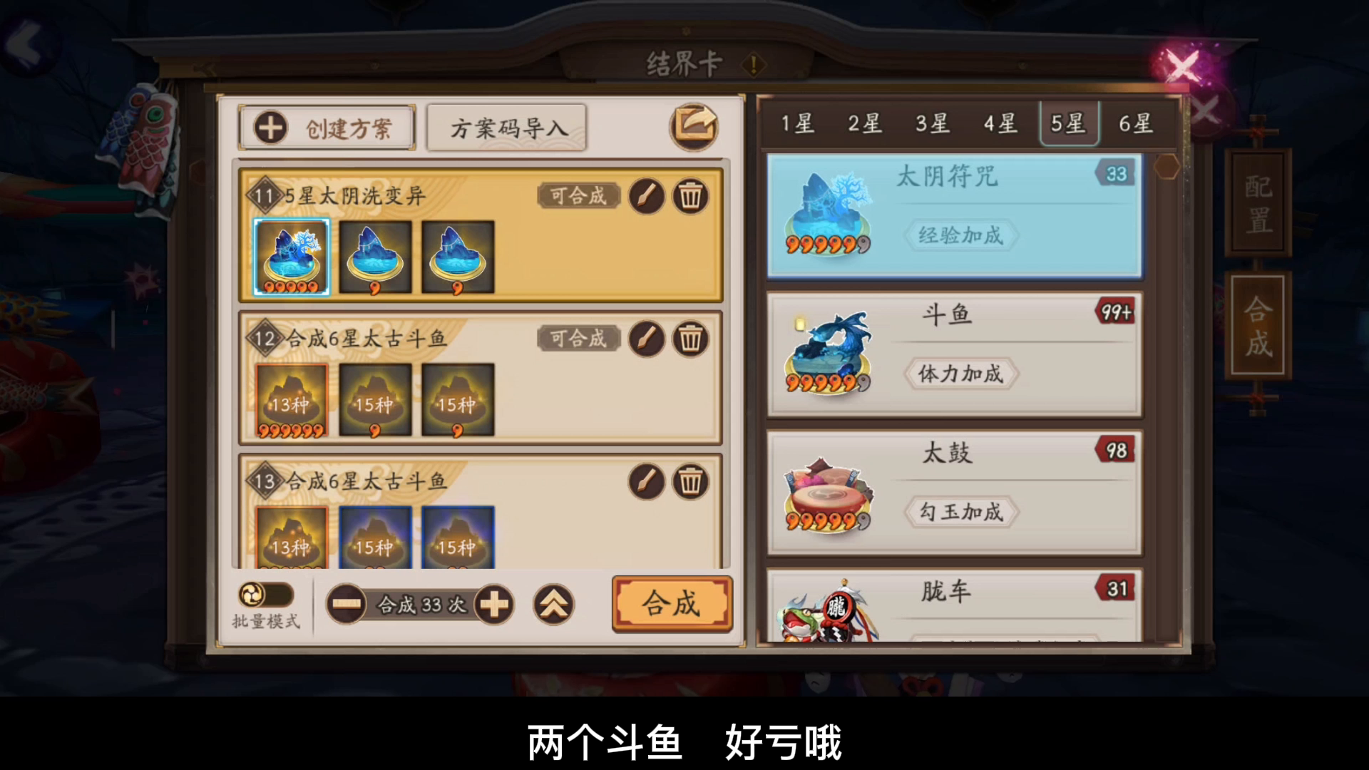 阴阳师:努力一下,把四星五星太阴符咒洗洗,希望多变几个太鼓,从此发家致富,走上大佬位置,哈哈哈,想的真美。 虽然太阴符咒变异成太鼓要花费很多小太阴,但是太阴本身没什么价值,我也没有办法,变成太鼓才是最有价值的,最少也要变成伞室内才有一点价值,所以只能忍痛合成一下了,合成好几次才变几个太鼓,太难了。#TapTap七周年安利狂欢节#攻略#游戏推荐#宝藏厂商#游戏福利#游戏讨论