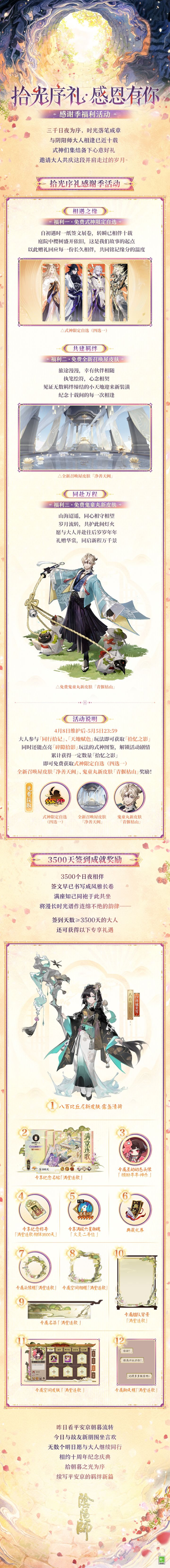 寒来暑往,白驹过隙,从平安京庭院中的初遇,到相伴近十载的岁岁相依,时光沉淀着彼此不可磨灭的羁绊。崽崽们特地倾献心意,备下十周年启幕好礼,邀大人共赴这场即将到来的十周年之约——△ 拾光序礼感谢季活动※4月8日维护后-5月5日23:59,大人参与「同行拾记」、「天地赋色」玩法即可获取「拾忆之影」,同时还能点亮「碎隙拾影」玩法的式神图鉴,解锁活动剧情与特别邮件。※累计获得一定数量「拾忆之影」,即可