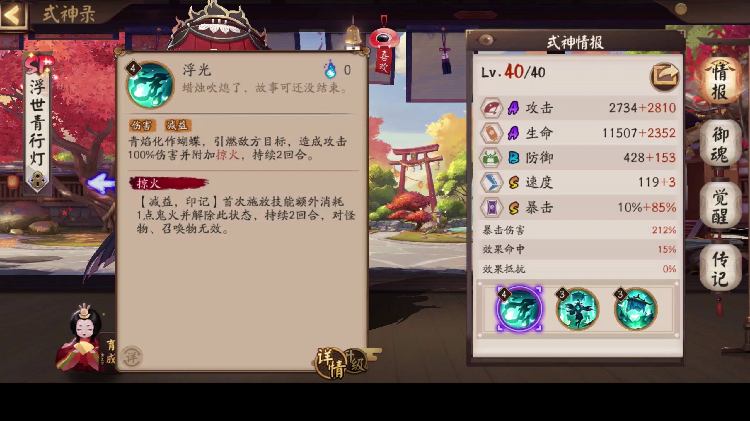 阴阳师:我为了打逢魔之时养的浮世青行灯,浮世青行灯的普攻加满了,之前没黑蛋加上不想他普攻加满就一直没有喂满技能,上次活动开SSR卷又出了个浮世青行灯所以我现在反喂一下看看会不会有所好转,可惜了呀。
