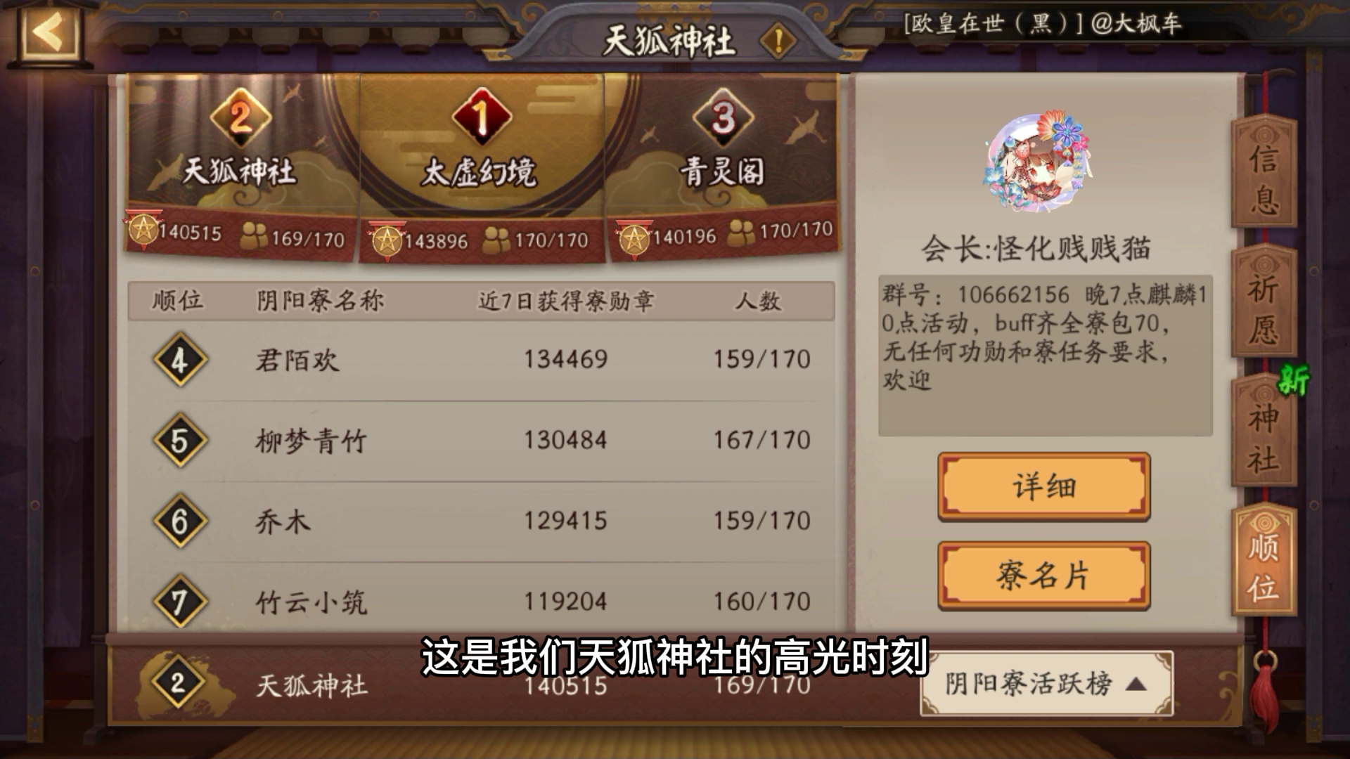 阴阳师:天狐神社的高光时刻,原本是榜一大哥的,但是因为周一结算了就变榜2大哥了,开森,感受到羽毛大军的压力了吗?哈哈哈。