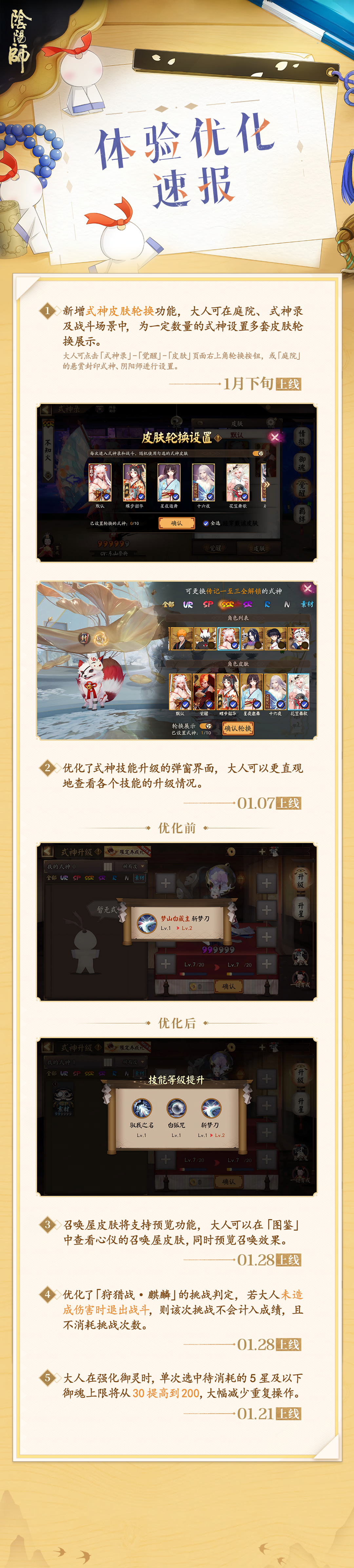 万象焕新,共启新岁。平安京的每一抹新颜,皆源于大人们的热爱与建议。阿扫已经整理好了「平安京体验优化速报第四弹」!大人快点开长图,看看平安京又添了哪些新变化吧~ 大人在游戏过程中若有任何想法或建议,欢迎通过游戏内「头像」-「设置」界面的「快捷反馈」传达给寮办,期待与各位大人一起建设更美好的平安京~#阴阳师月自长梦升 #阴阳师