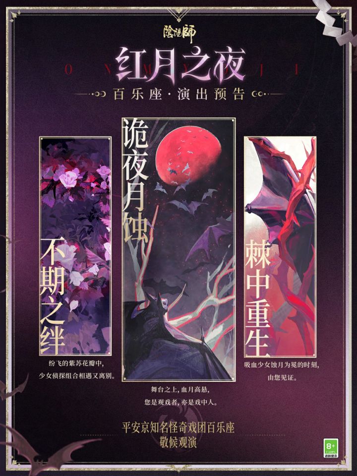 大人!十万火急——阿扫刚刚收到了一封跳跳妹妹的紧急求助信!原来是跳跳一家在前往百乐座戏团演出的途中,与意外结识的新伙伴吸血姬一起,被卷入了一桩扑朔迷离的连环凶案!信里还附上了这张演出预告单,其中暗藏的是破案线索,还是在预示演出当日的种种异象?大人和阿扫一起前去一探究竟吧!#阴阳师诡夜百戏 #阴阳师