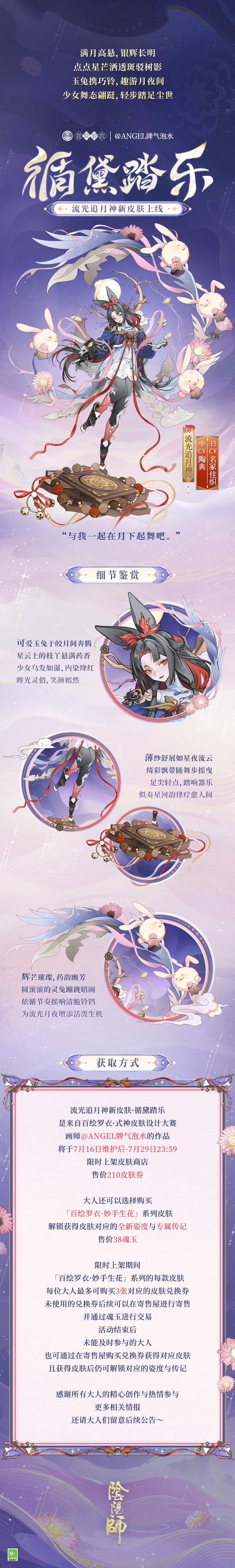 枫落秋庭,墨意凝寒刃;黛风拂月,药韵愈尘世。 △百绘罗衣系列「鬼切·秋庭流枫」、「流光追月神·循黛踏乐」两款皮肤,将于7月16日维护后-7月29日23:59限时上架皮肤商店,售价210皮肤券。大人还可选择购买「百绘罗衣·妙手生花」系列皮肤,解锁获得皮肤对应的全新姿度与专属传记,售价38魂玉。 △限时上架期间,「百绘罗衣·妙手生花」系列的每款皮肤每位大人最多可购买3张对应的皮肤兑换券,未使用的兑换