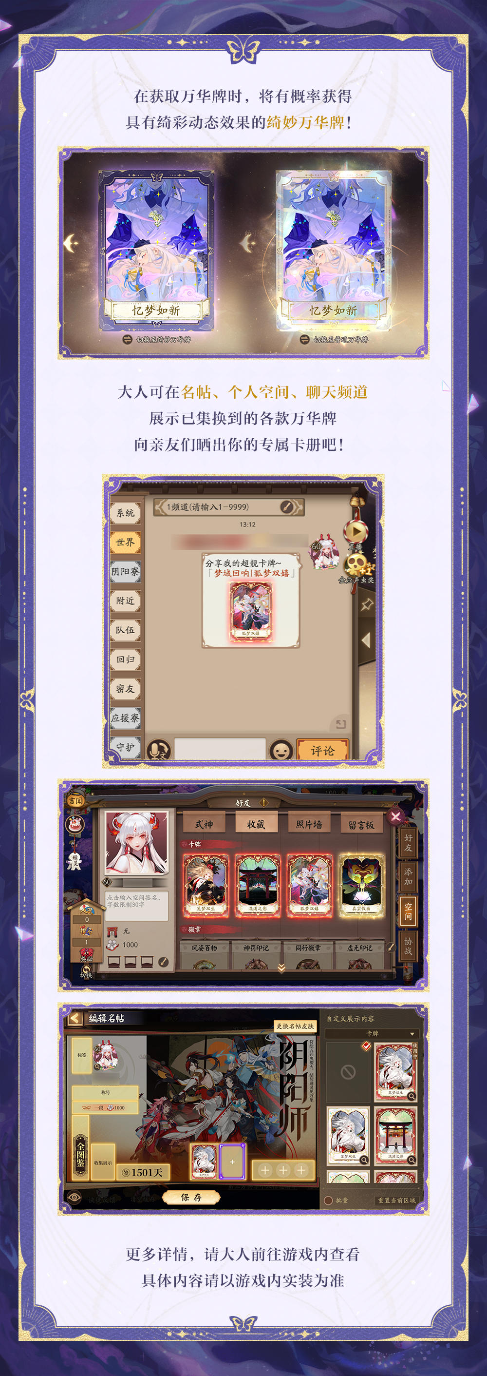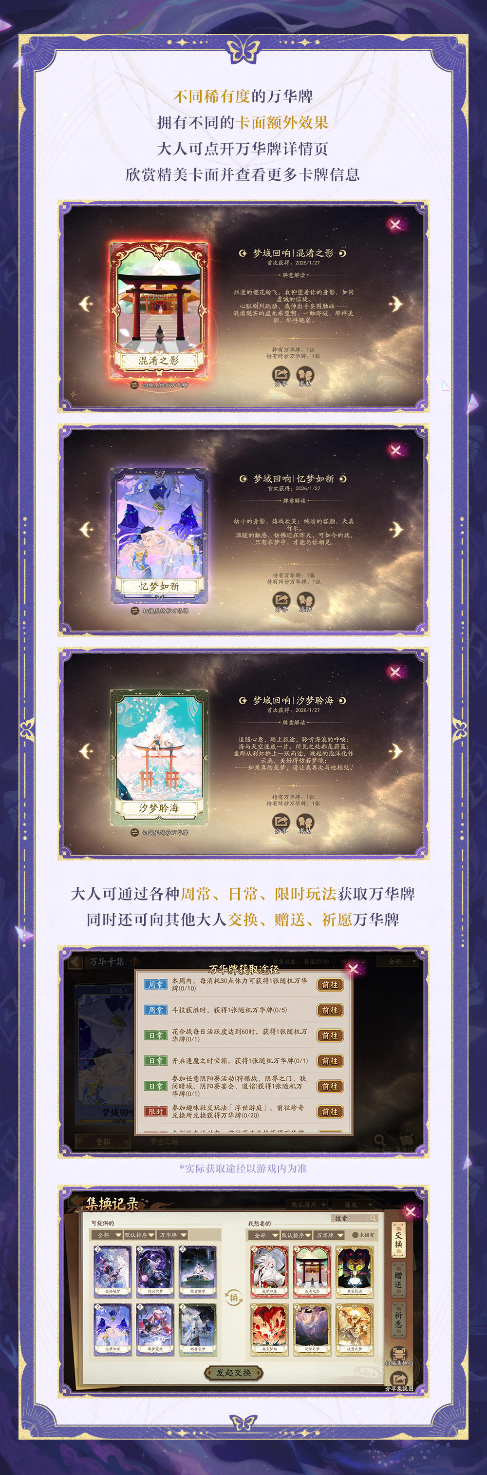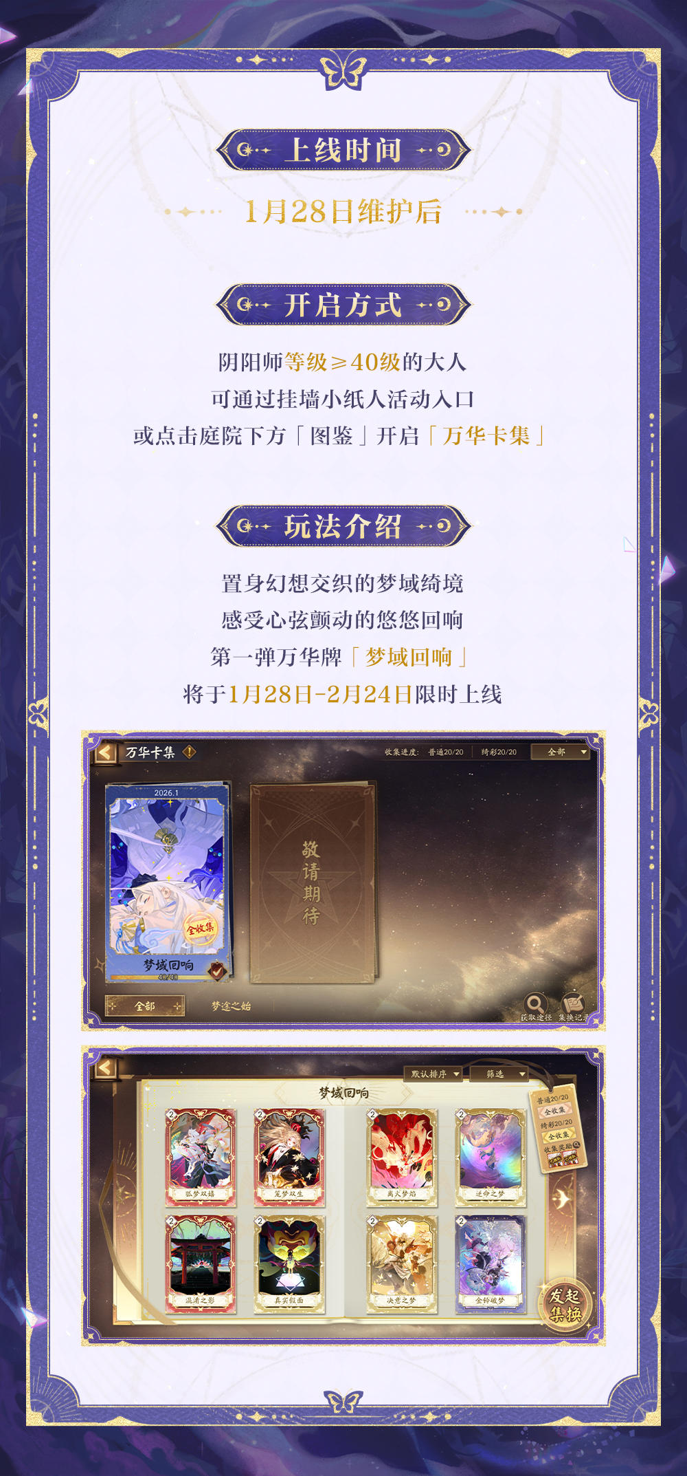 宿光焕银辉,振袖引星回,灵木苍龙巡碧落,东风破晓叩春扉。 △全新「步野观星」系列皮肤即将上线!晴明新皮肤「星蛟宿影」将于1月21日维护后-2月10日23:59限时上架「星品专卖店」活动,大人参与活动祈愿即可兑换。 ※活动期间,大人使用「星宿福札」进行祈愿可获得「星宿印记」等奖励,首次进入活动可获得5个「星宿福札·免费」。「星宿印记」可用于兑换商店中两款全新限定皮肤,两款全新姿度「晴明·星仪纸扇·灭