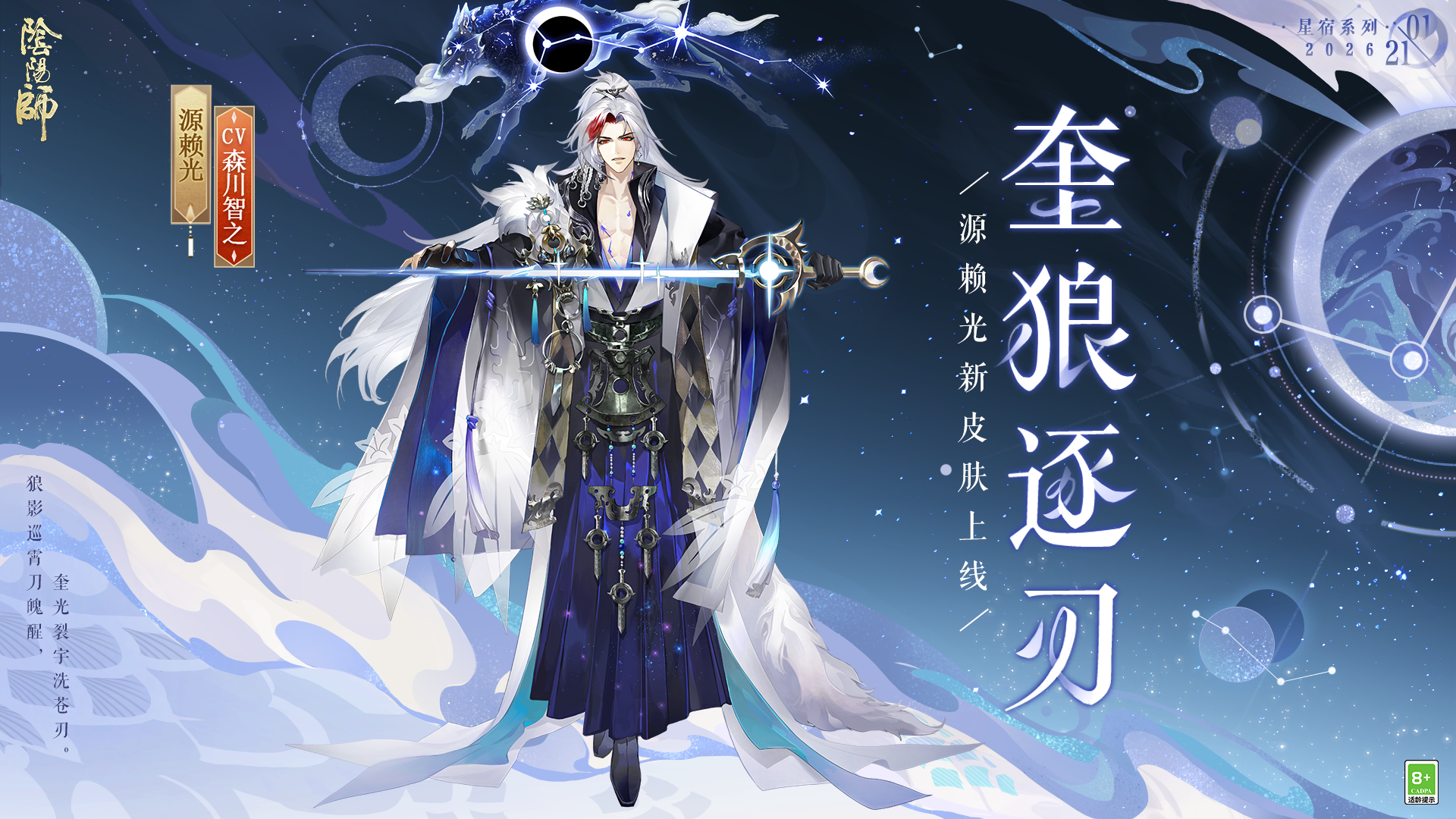 奎宿巡天,狼影逐群星,万相星文凝刻苍刃,剑引星光镇守八荒。 △全新「步野观星」系列皮肤即将上线!源赖光新皮肤「奎狼逐刃」将于1月21日维护后-2月10日23:59限时上架「星品专卖店」活动,大人参与活动祈愿即可兑换。 ※活动期间,大人使用「星宿福札」进行祈愿可获得「星宿印记」等奖励,首次进入活动可获得5个「星宿福札·免费」。「星宿印记」可用于兑换商店中两款全新限定皮肤,两款全新姿度「晴明·星仪纸扇