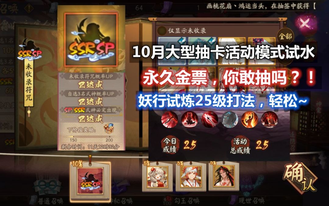 【阴阳师】10月大型自选抽卡试水:永久金票未收录SSR/SP,值得抽吗?!白狼妖行试炼25级打法,轻松过~