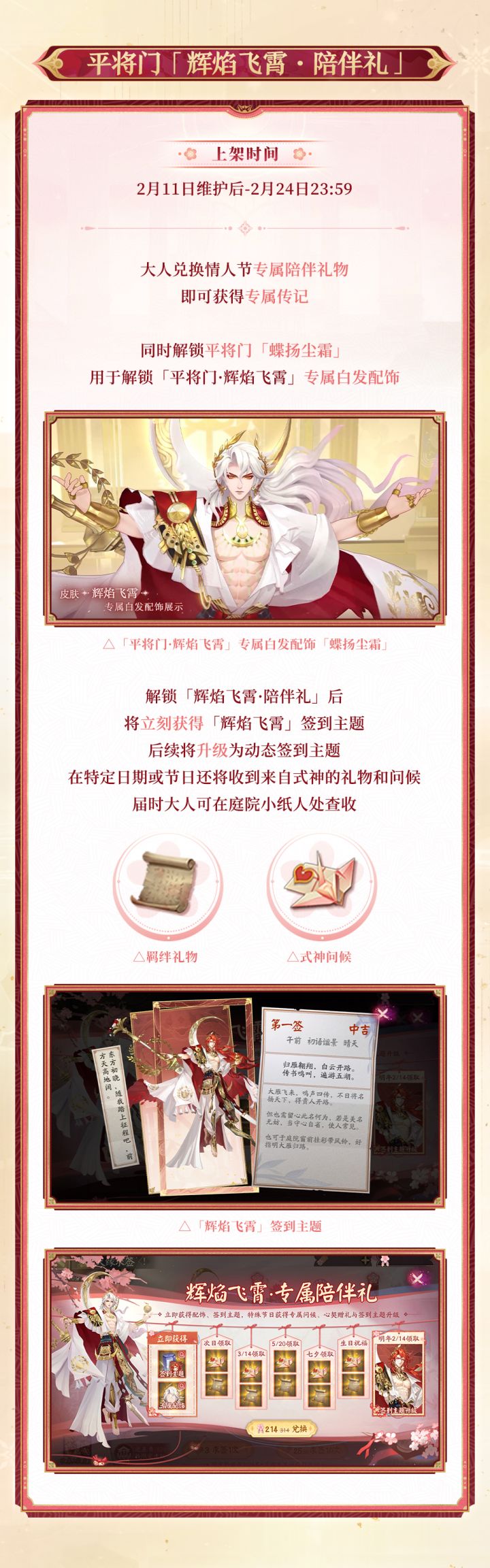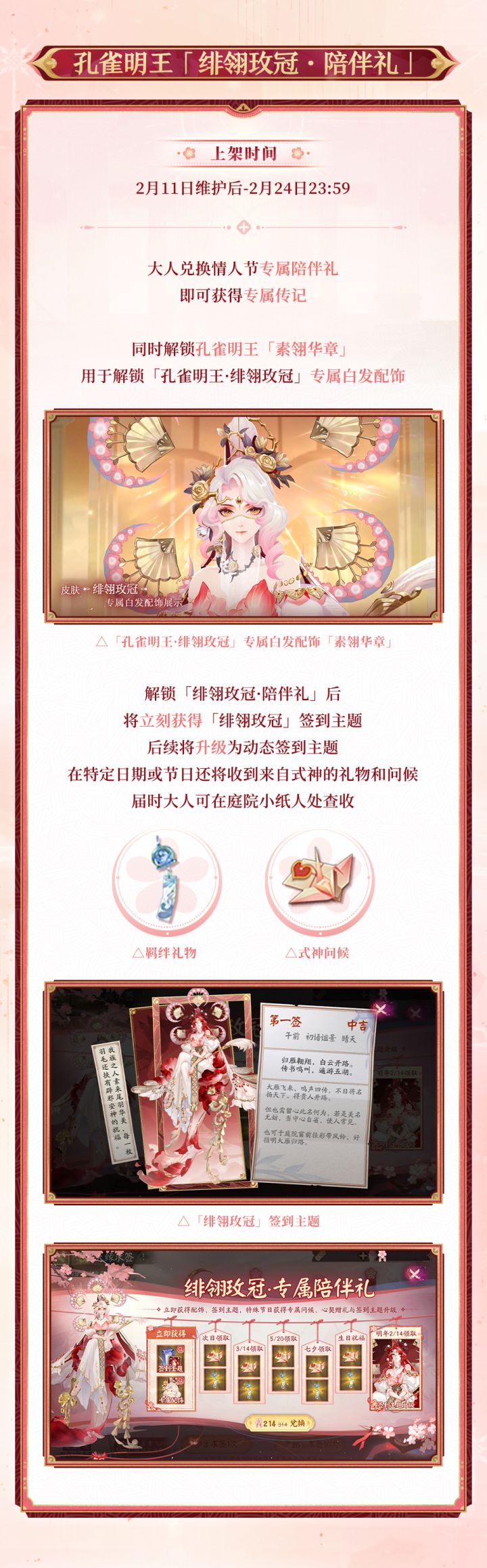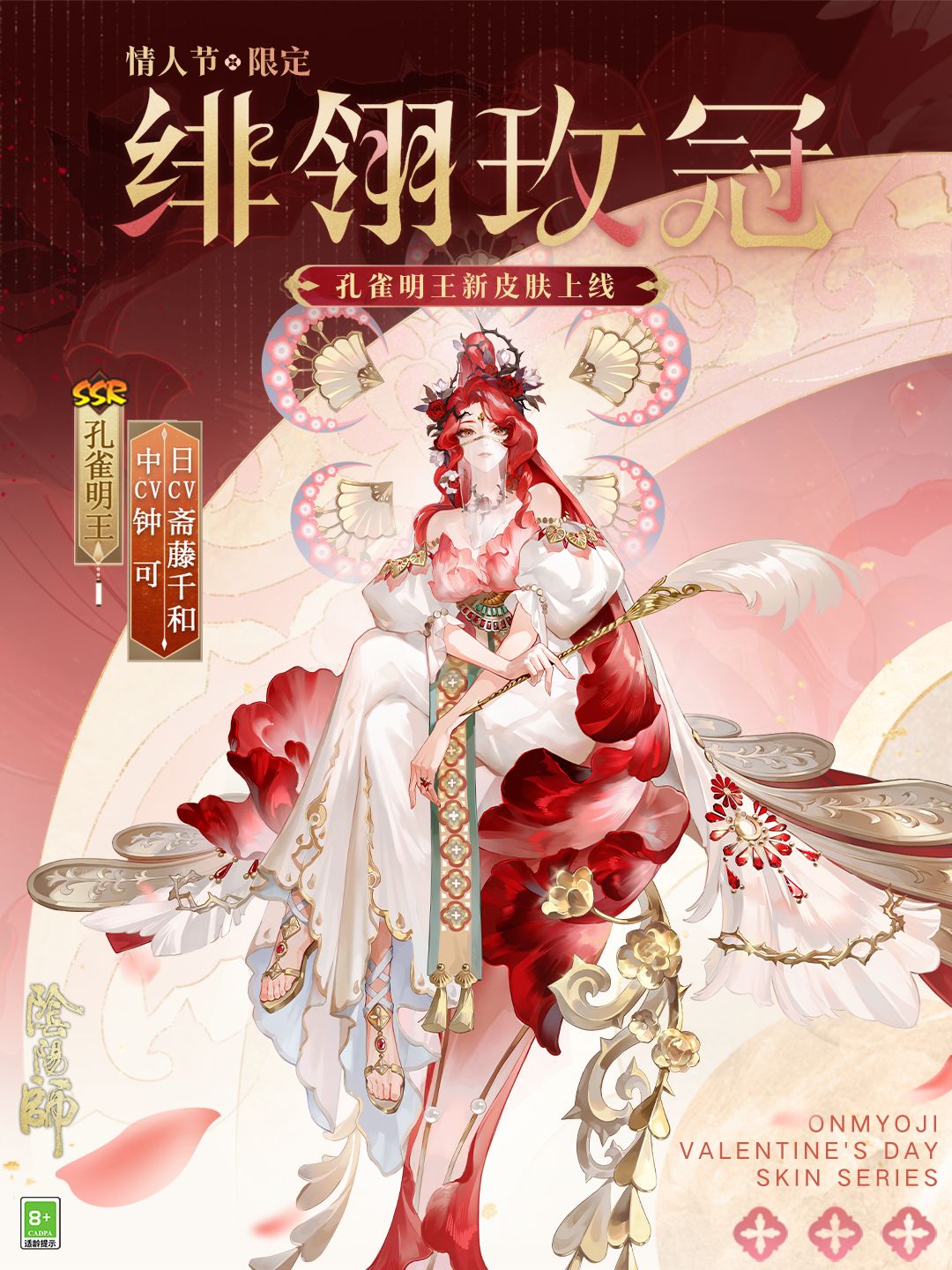 玫瑰盛放荆棘之上,她宛若执掌美的神明,热烈而优雅地独舞。孔雀明王新皮肤「绯翎玫冠」2月11日维护后-2月24日23:59上线! 「你听说过危险的美丽么?」 △获取方式 ※大人可通过「巧意良缘」-「天缘求签」活动,购买并使用「天缘锦签」,求签后可获得「结缘樱」、「御行达摩(碎片)」等奖励。 ※前往活动商店使用「结缘樱」即可兑换「情牵绮梦」系列新皮肤第二弹「孔雀明王·绯翎玫冠」、孔雀明王「绯翎玫冠·陪