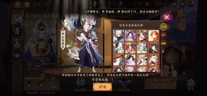 新区萌新目前抽了五百抽了前三张是我有的式神,后面是自选的,七日和十五日自选,五百抽的自选(感觉里面没什么好用的了),两个sp/ssr自选(其中一个准备选大缘,剩下一个不知道选什么),还有一张神券