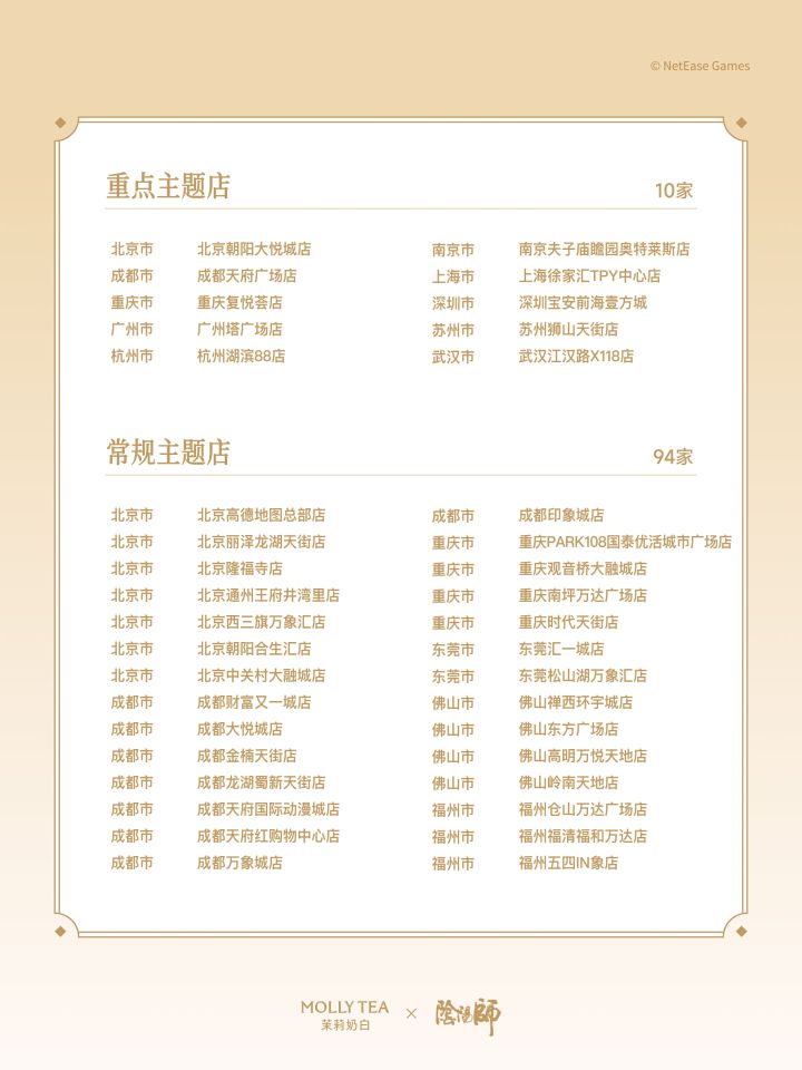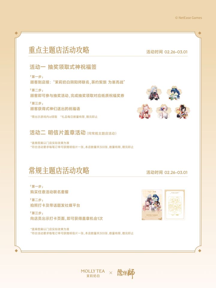 檐下风铃动,店内茶烟生。2月26日-3月1日,十八城联名主题店将备好春日茶席,只待各位大人推门而入,细品醇香茶饮。参与联名主题店活动,有机会领取限定联名盖章明信片;重点主题店还可参与抽签活动得式神崽崽们的祝福奖券哦!更多详情大人可戳图片了解~※重点主题店和常规主题店活动存在差异,请以具体门店实际情况为准※一日店长活动将于3月1日14:00-19:00于杭州湖滨88店、广州塔广场店开启※具体