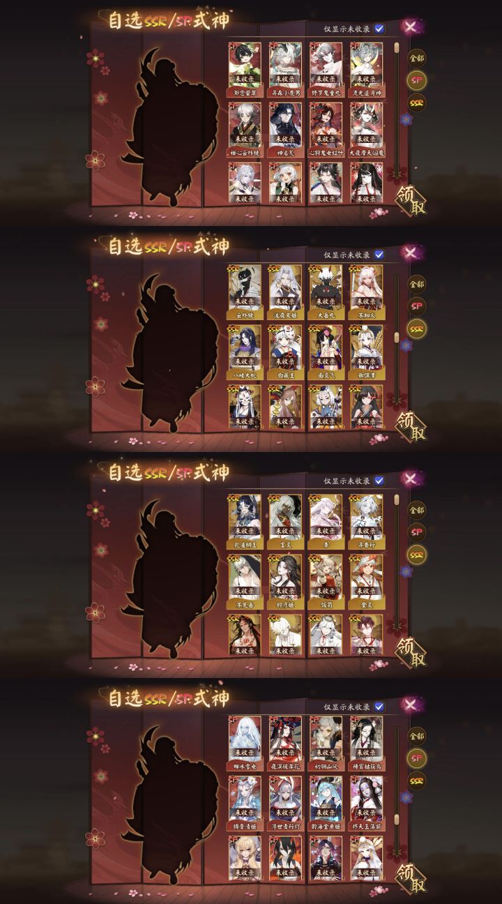 新区萌新目前抽了五百抽了前三张是我有的式神,后面是自选的,七日和十五日自选,五百抽的自选(感觉里面没什么好用的了),两个sp/ssr自选(其中一个准备选大缘,剩下一个不知道选什么),还有一张神券