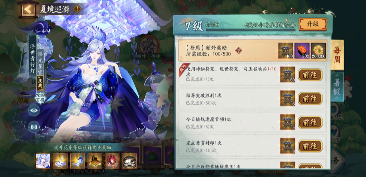 星灯流转,故事被接连遗忘,欲念幻化成妖;青蝶振翅,紫焰破茧而出,唤醒冥冥长夜—— 直到最后的物语被记述,漫天星辰散落,一切都将重归寂静。 「第一百零一个故事,交给你了。」 浮世青行灯全新典藏·庆典皮肤「瑶光星宫」将于7月3日维护后上线,大人可通过参与「夏境巡游」活动免费获得! ↓↓↓ △活动时间:7月3日维护后-9月3日23:59 △活动介绍: ※活动期间,等级≥15级的阴阳师大人通过参与每周开放