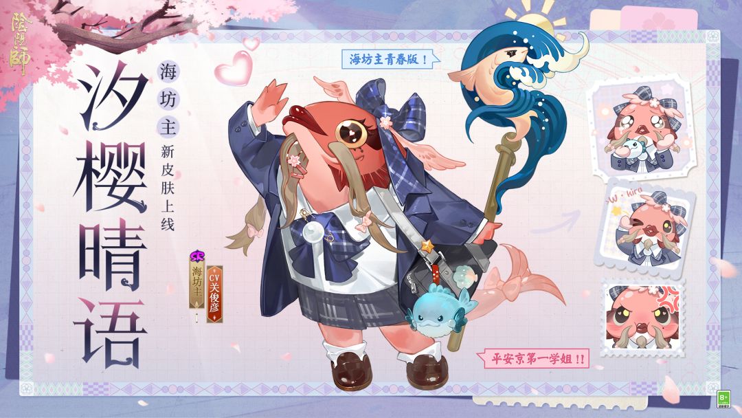 精心打理胡须,穿上一身青春制服,装扮成学生模样~今天天气不错,一起乘着海浪出发咯! 海坊主新皮肤「汐樱晴语」将于3月25日维护后-4月7日23:59上线,大人可在鱼人节活动「春樱圆舞曲」中获取,并解锁全新语音! 平安京第一学姐——可盐可甜的海坊主身着JK制服靓丽登场!同学,今天放学也一起走吧~ 全平台互通新区【良夜之畔】已开启预约集结,将于4月1日9:00正式开服!多多福利等你来拿! #海坊主新皮