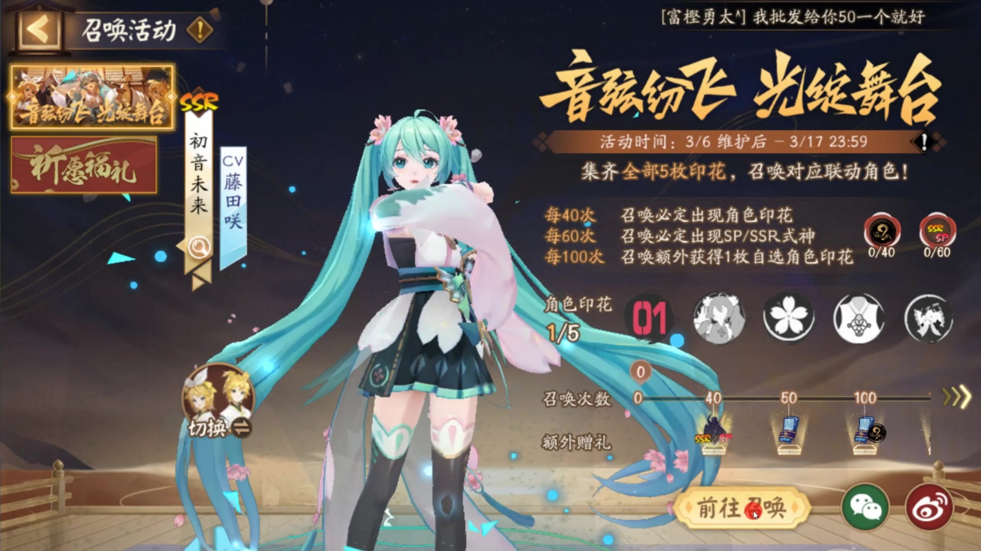阴阳师:我刚开始选的式神是镜音连,抽齐了镜音连以后就抽的初音,但是初音印花全是保底,这不是伤害到我了吗,所以我决定不抽了,只能靠白嫖每日免费一抽再拿个印花了,就结束这次的抽卡,我不想花那么多勾玉了。#今天游戏圈发生了啥#游戏推荐#游戏安利#攻略#游戏资讯#单机游戏