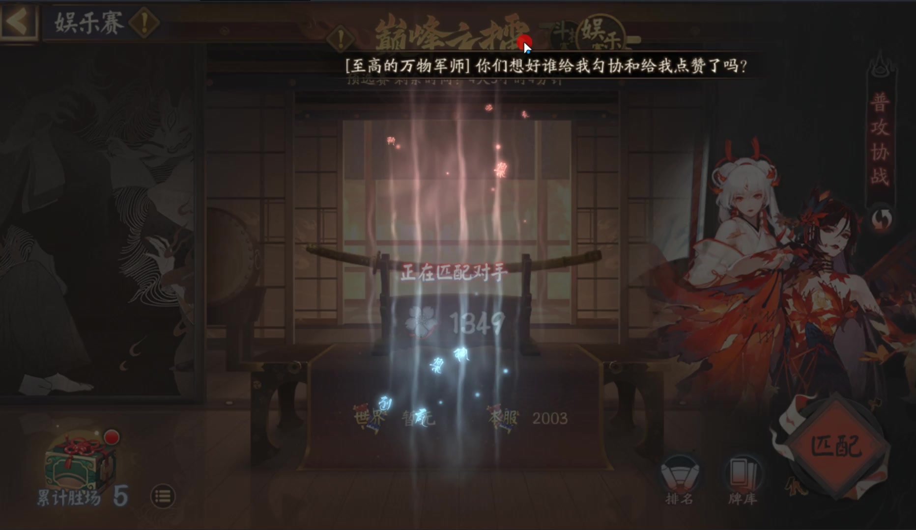阴阳师:这次的为崽而战有两个模式,一个是正常打斗技的,另一个就是这个娱乐模式,我玩了好几把了,所以我来讲解一下娱乐模式的玩法,关于输赢的话没有很大把握,都是自动的,而且我都玩这个模式了我还在意输赢吗?#重返未来1.6新春版本征集活动#攻略#游戏推荐#游戏福利#单机游戏#游戏讨论