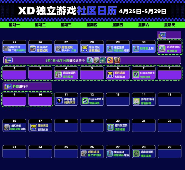 五一假期即将到来,等等党们一直期待的限时折扣也即将开启。在5月1日-5月14日,XD独立游戏将开启一波五一折扣,参与本次折扣活动的游戏有:《泰拉瑞亚》、《人类跌落梦境》、《去月球》、《恶果之地》、《钢琴师》。折扣将在5月1日上午10时正式开始(别早了!),折扣持续时间,以及期间的其他社区福利活动,都可以通过XD独立游戏社区日历查看。在玩家交流群内,我们也会及时更新社区日历的内容,预告即将到来