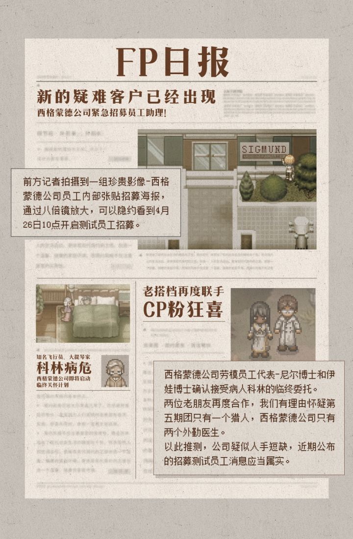 小记者为大家带来最新简讯!知名飞行员,令人尊敬的大提琴家——科林病危,西格蒙德公司即将启动临终关怀计划。本次病例依旧由老搭档尼尔博士和伊娃博士受理,公司疑似人手短缺,被小记者捕捉到即将在4月26日10点开启内部测试员工招募,协助两位博士一同开启这段记忆修改旅程。根据小记者的多方查证,消息确凿!想应聘的小伙伴记得明天同一时间蹲点公司最新情报哦~当然小记者也通过内部渠道搞来了15个测试名额,就