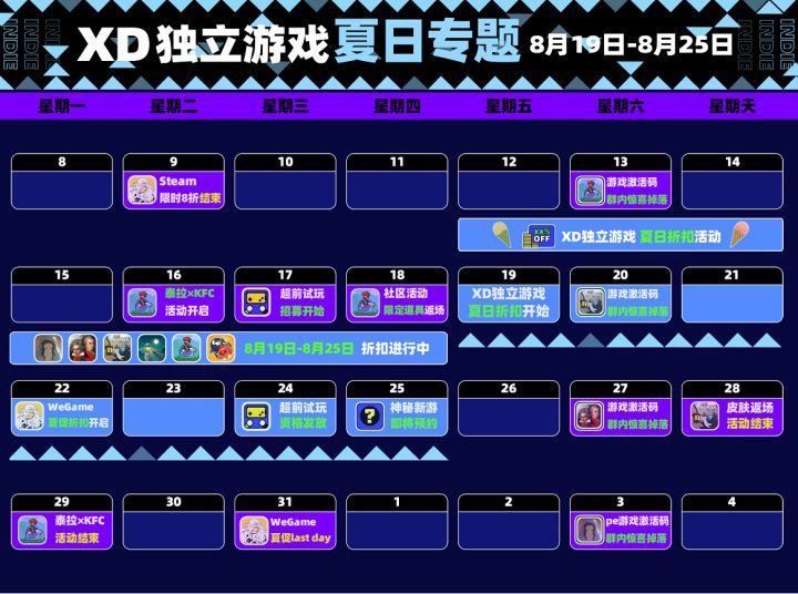 大家好,XD独立游戏夏日专题即将开启!在8月19日-8月25日,XD独立游戏的部分游戏会开始夏日折扣。参与本次夏日独立游戏专题折扣的游戏有:《泰拉瑞亚》、《人类跌落梦境》、《部落与弯刀》、《去月球》、《恶果之地》、《钢琴师》。折扣将在8月19日(上午10时)正式开始,折扣的持续时间,以及期间更多的社区以及玩家群福利活动,都可以在XD独立游戏社区日历了解!在专题折扣之外,在折扣期间(8月19