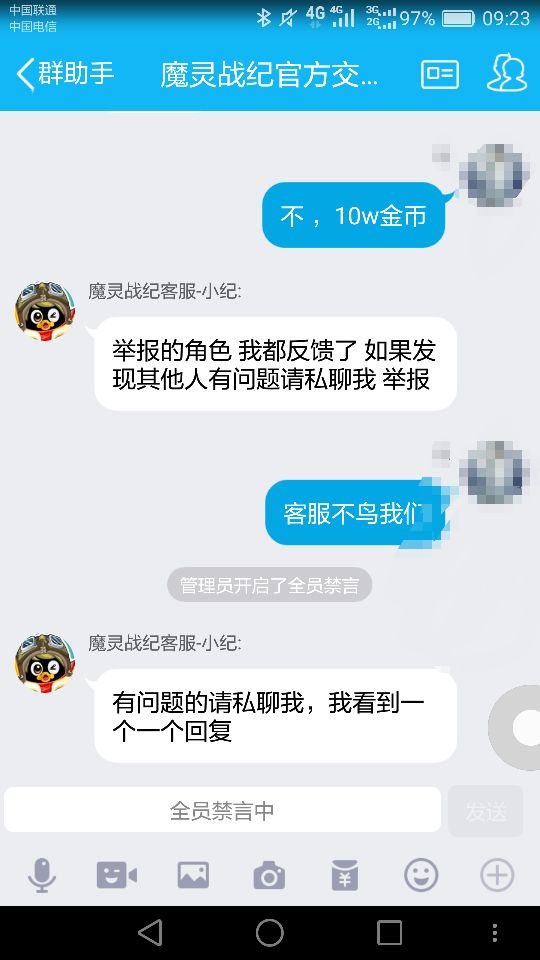 官方的权利真大,我们帮忙举报玩家,看玩笑说要奖励,直接全体禁言,没有入坑的同志们千万别玩,玩家在他们眼里一点价值都没有,充钱就是,呵呵。真是垃圾。