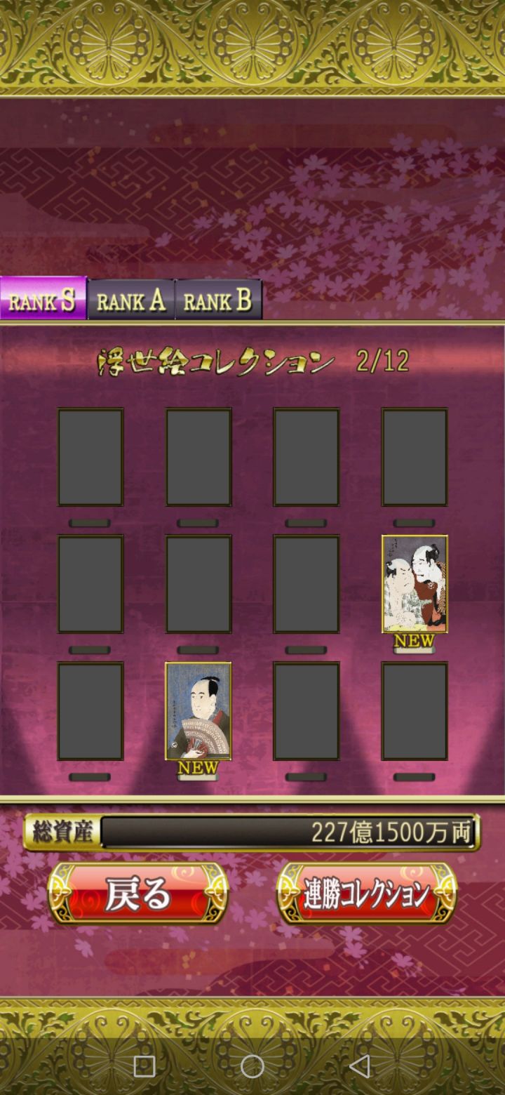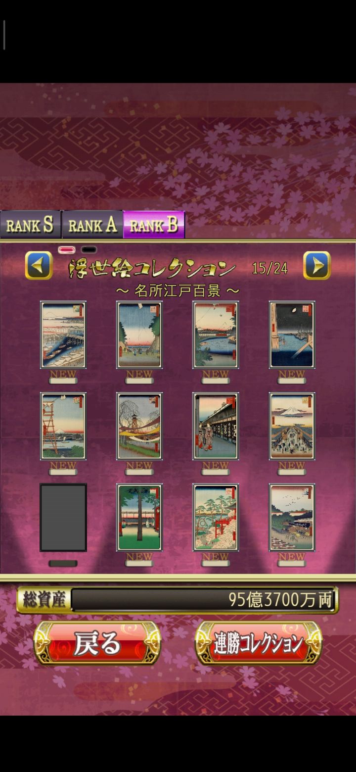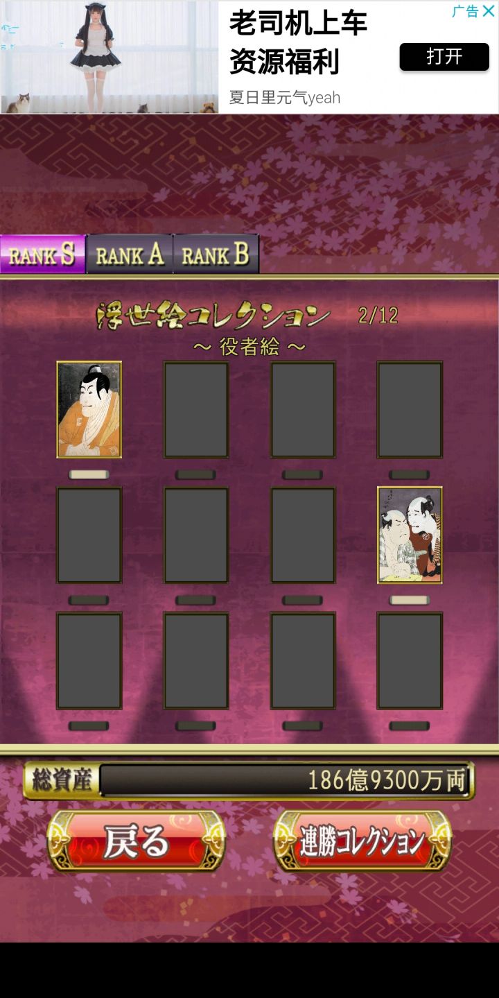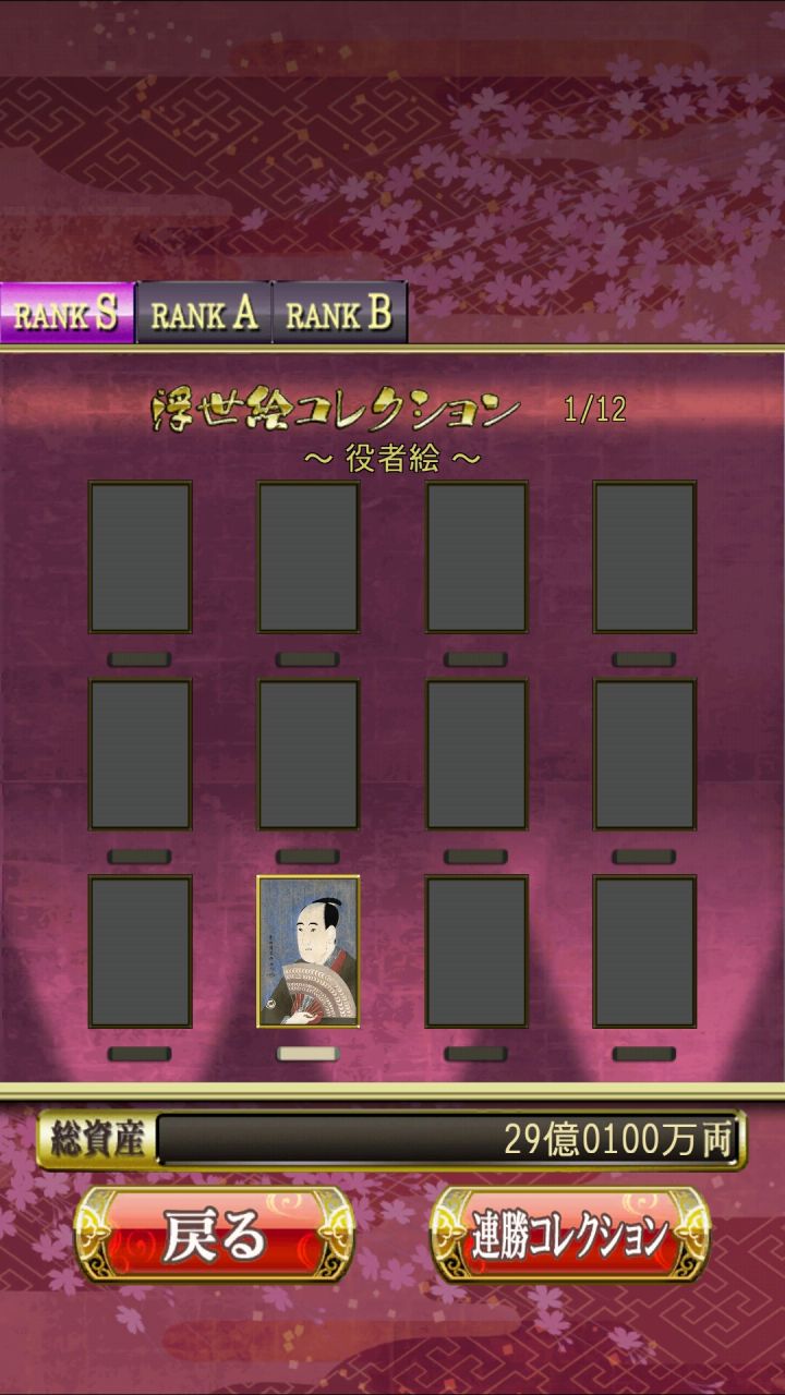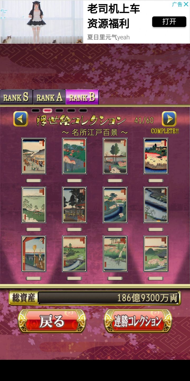 花札MIYABI会根据玩家打出的成绩评级,从而得到不同的收集品即浮世绘。这个游戏的评级有两个考量,一个是单局的成绩,另一个是连胜数量。单局评级数据:RANK C:01-04文RANK B:05-14文RANK A:15-24文RANK S:达到25文连胜评级数据:RANK B:连胜10局RANK A:连胜20局RANK S:连胜30局其中RANK B、RANK A、RANK S