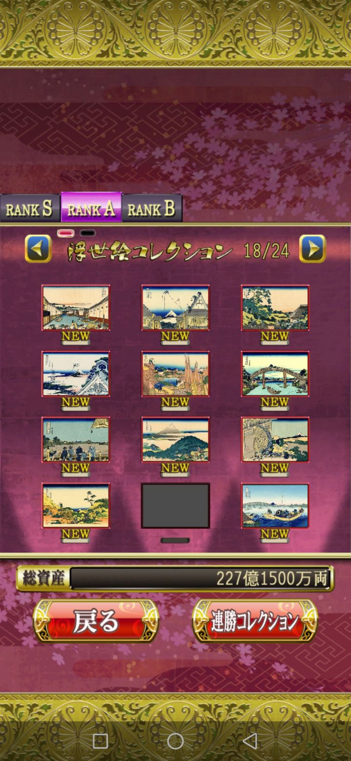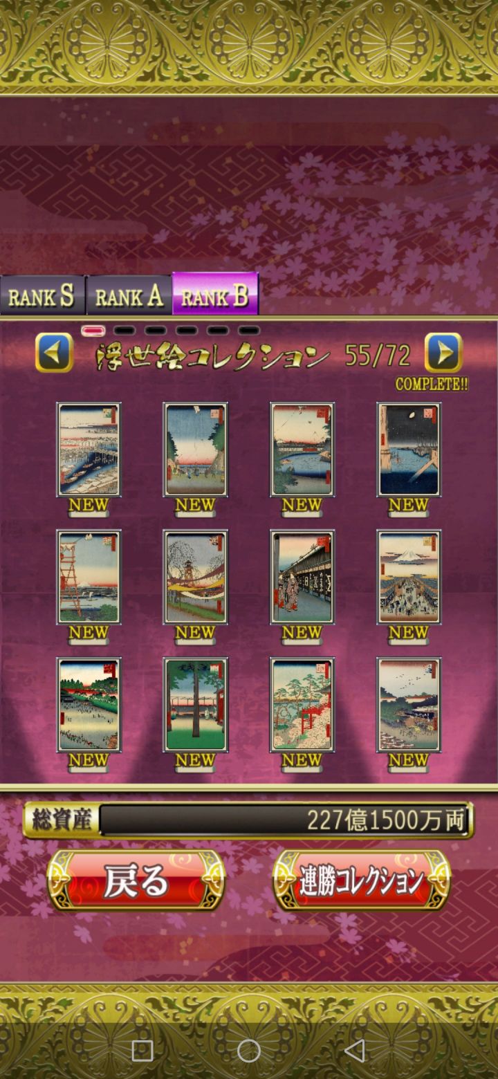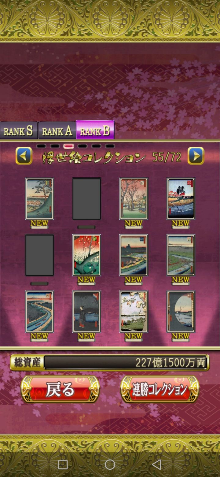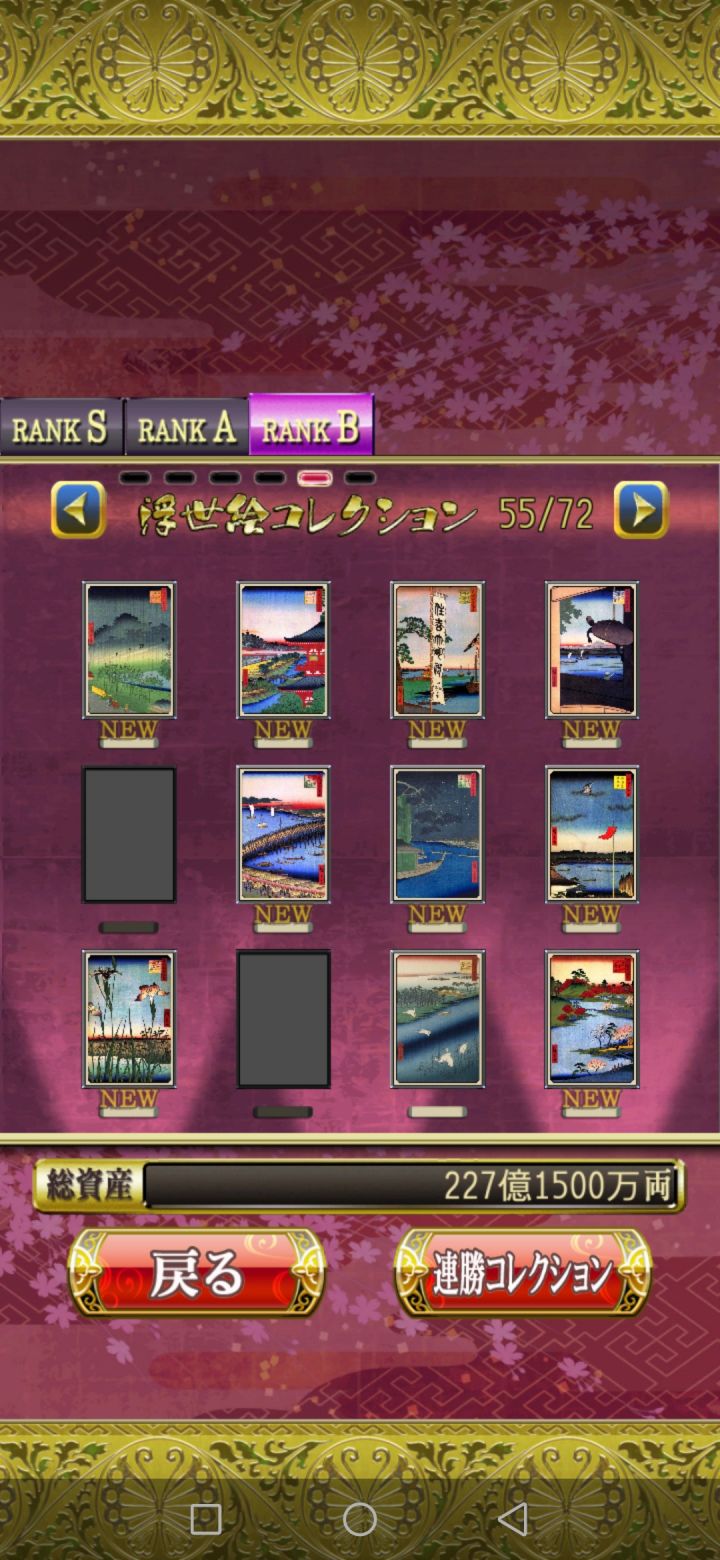花札MIYABI会根据玩家打出的成绩评级,从而得到不同的收集品即浮世绘。这个游戏的评级有两个考量,一个是单局的成绩,另一个是连胜数量。单局评级数据:RANK C:01-04文RANK B:05-14文RANK A:15-24文RANK S:达到25文连胜评级数据:RANK B:连胜10局RANK A:连胜20局RANK S:连胜30局其中RANK B、RANK A、RANK S