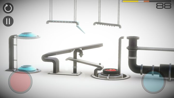 键位设置如图,小球划落后按住红键让小球加速,然后立即放开(不然会因为时间问题而无法再次加速),之后按下蓝键(不能按太久,不然小球会被吹走,只要传送过去就放开),小球传送过去后立即放开蓝键按下红键,然后小球会落在红色移动板上,然后轻按蓝键把小球吹进导管中,完成