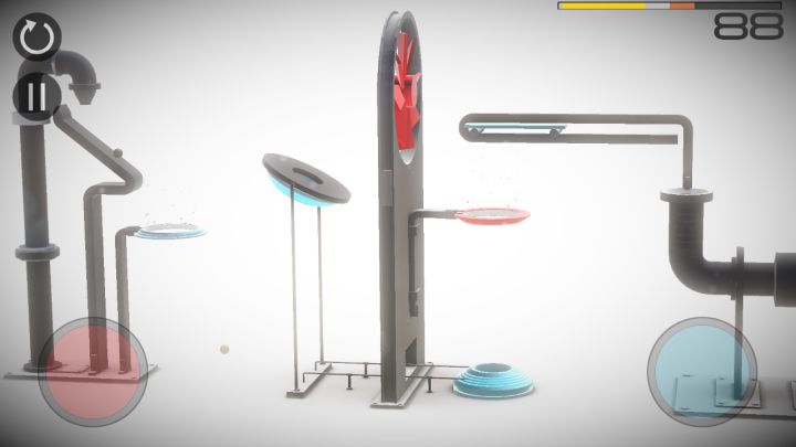 键位设置如图,小球划落后按住红键让小球加速,然后立即放开(不然会因为时间问题而无法再次加速),之后按下蓝键(不能按太久,不然小球会被吹走,只要传送过去就放开),小球传送过去后立即放开蓝键按下红键,然后小球会落在红色移动板上,然后轻按蓝键把小球吹进导管中,完成