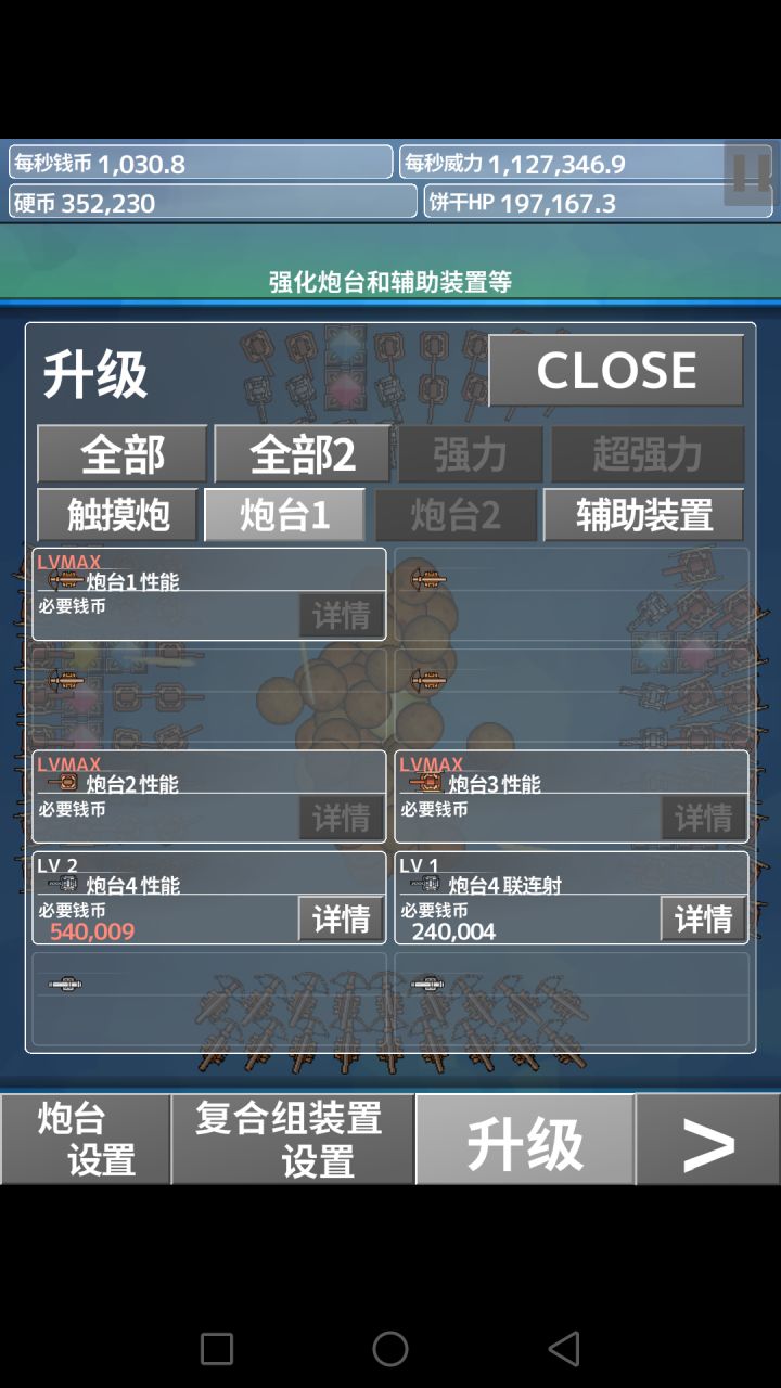 多图预警。(十个0代表10,000,000,000)1.钱币够买什么就买。2.强力栏十个0开启,超强力十三个0开启。3.电阻器安置32个时解锁剩余3个技能,炮台1性能2满级50级,49升50大概耗费十二个0。50级性能2电阻器威力介于导弹发射器和多导弹发射器威力之间。4.炮台出售返还50%钱币花费。5.广告问题,手机设置关闭该应用网络权限。6.辅助和炮台1:1数量布置。7.由于高火力