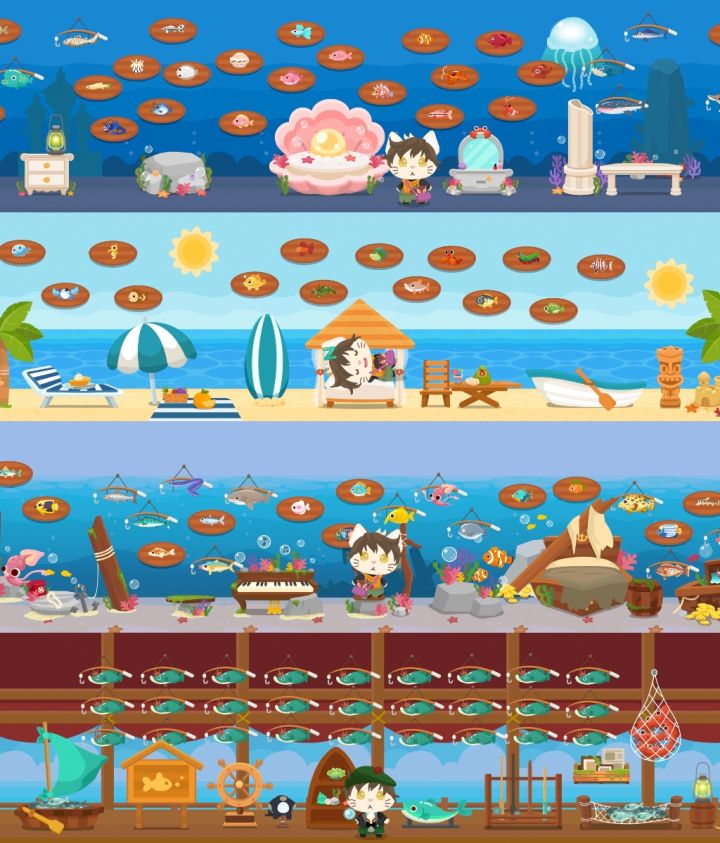 小學的時候就很喜歡把魚標本鋪滿1-2樓,把家裏變成海洋世界🐟,現在有條件可以盡情鋪啦選擇三層壁紙有體現海的主題層來鋪魚🐬第一張是Underwater,背景很像《海洋奇緣》裏莫阿娜拿到特菲提之心的地方~剛好把魚全部鋪在海平面下方🐳第二張是Ocean,有點亂,海洋家居我還在釣🐋第三張是Tropical,挺休閒的度假小海灘,有兩個來自One Ring的太陽🌞拍出來效果比想象好看所以蠻喜歡這三層